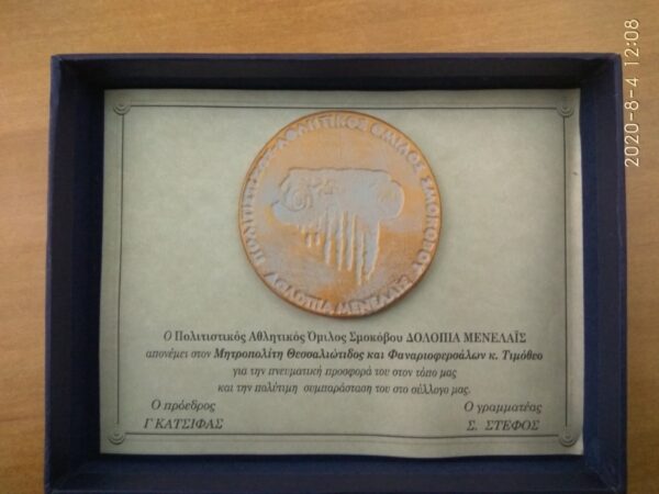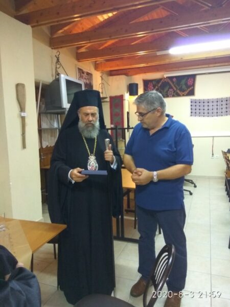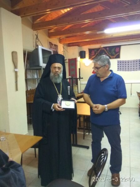 Ακολούθως, ο Σεβασμιώτατος μετέβη στον Πνευματικό Κέντρο του χωριού, όπου ο κ. Γεώργιος Κατσίφας εκ μέρους του Πολιτιστικού Αθλητικού Ομίλου Σμοκόβου απένειμε αναμνηστικό μετάλλιο για την πνευματική προσφορά του, αλλά και την πολύτιμη συμπαράστασή του στο Σύλλογο.