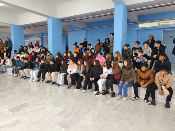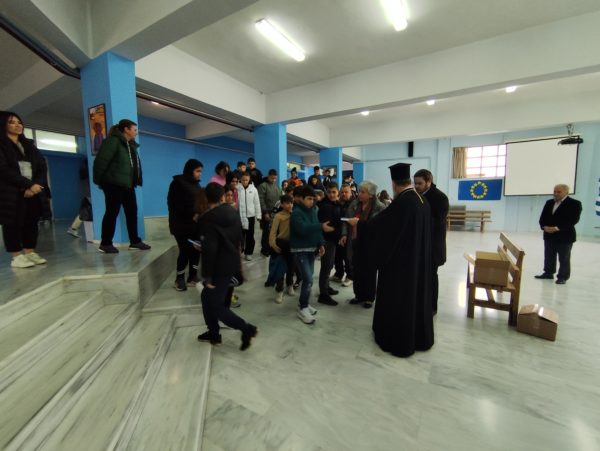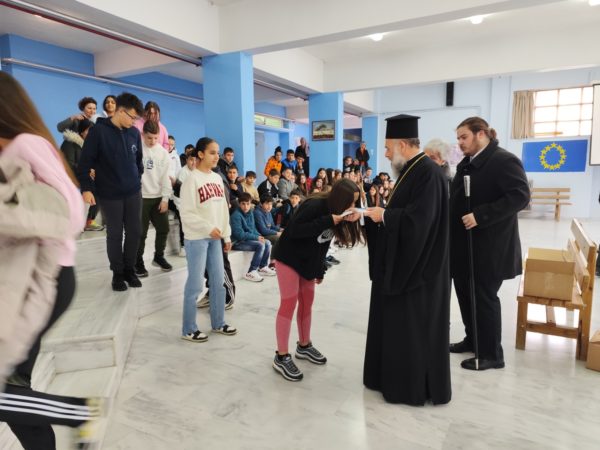 Ακολούθησε εποικοδομητική συζήτηση με τους μαθητές της πρώτης Γυμνασίου, στους οποίους διένειμε τευχίδιο της Καινής Διαθήκης ως ευλογία.