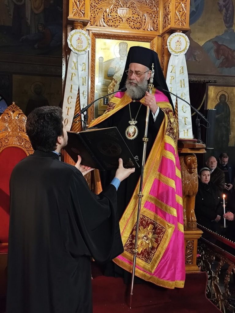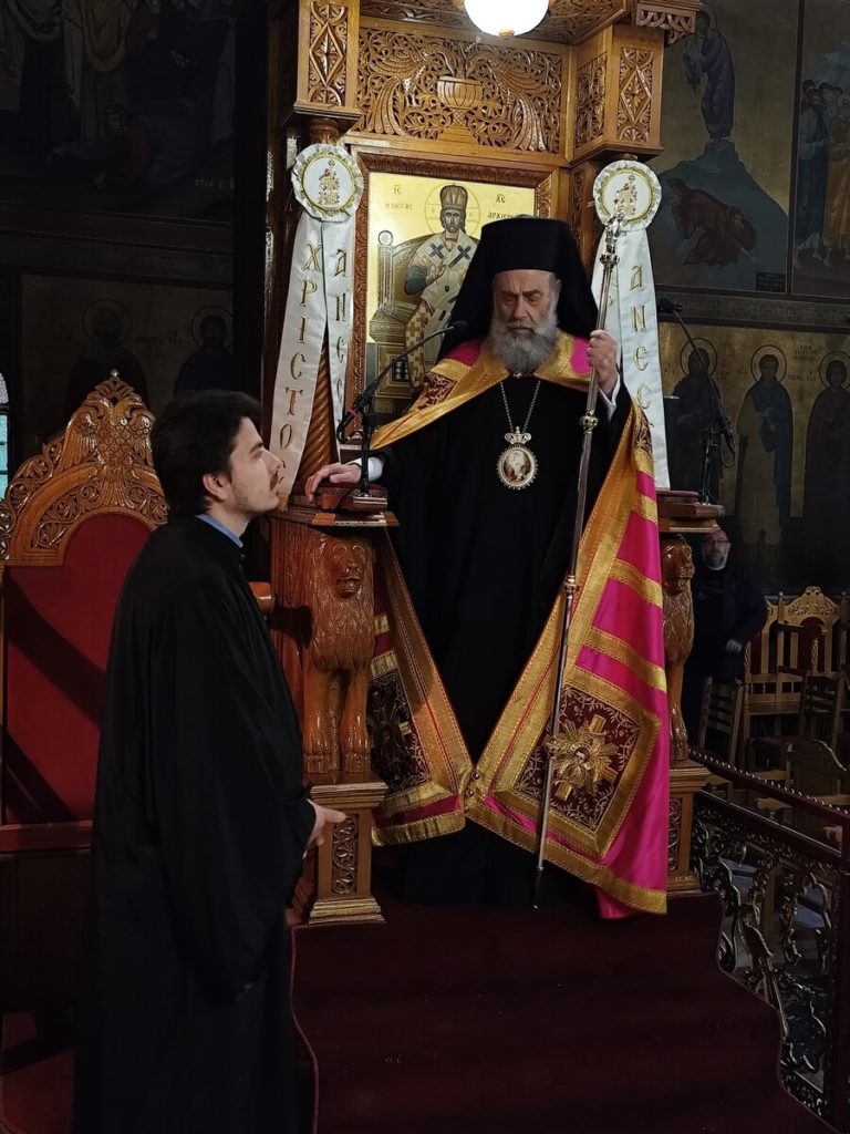 Προ της απολύσεως, ο Σεβασμιώτατος προέβη στη χειροθεσία εις Πρωτοπρεσβύτερον του κληρικού Λάμπρου Κρικέλη, απονέμοντάς του το οφίκιο της Εκκλησίας ως αναγνώριση της μέχρι τούδε ευδόκιμης, θυσιαστικής και καρποφόρου διακονίας του στον αμπελώνα του Κυρίου. Κατά την προσφώνησή του, επεσήμανε ότι η τιμή αυτή δεν αποτελεί απλώς μία διάκριση, αλλά κυρίως πρόσκληση για εντονότερη ευθύνη, ταπείνωση και διαρκή προσφορά προς το ποίμνιο, κατά το πρότυπο των Αγίων της Εκκλησίας και ιδιαιτέρως του τιμωμένου Μεγαλομάρτυρος Αγίου Γεωργίου.