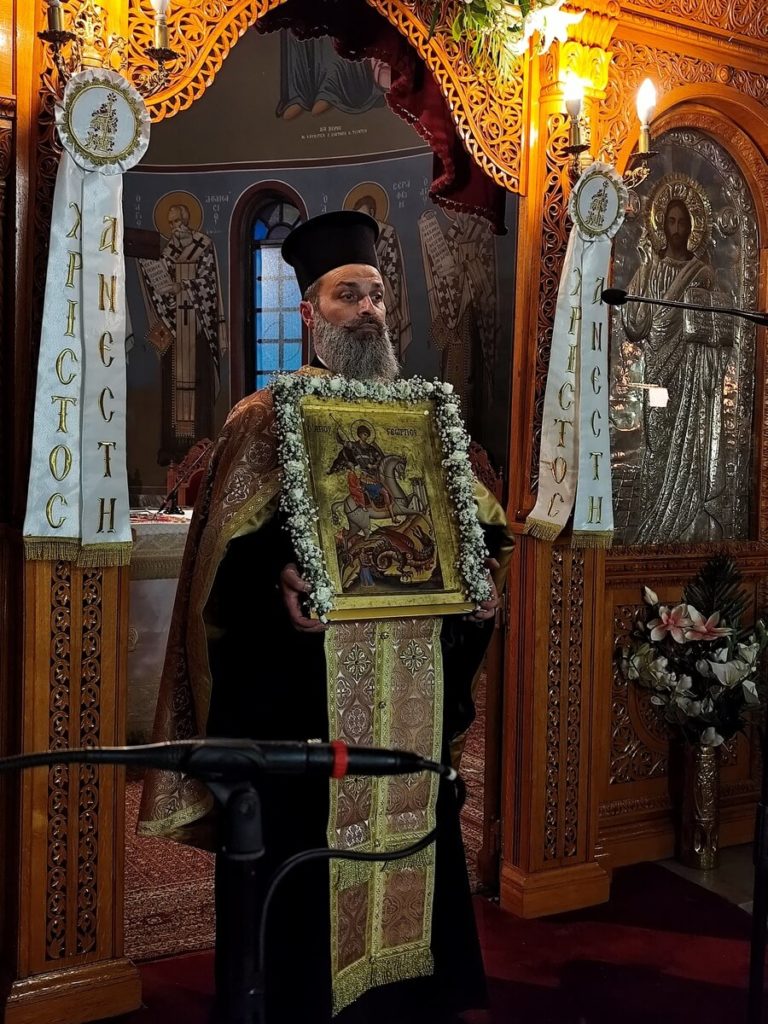 Στο τέλος της ακολουθίας, ο Σεβασμιώτατος απηύθυνε το θείο κήρυγμα, με λόγο ουσιαστικό και διεισδυτικό, αναδεικνύοντας το πρόσωπο και τη μαρτυρία του Αγίου Γεωργίου. Όπως ανέφερε, πρόκειται για έναν εξόχως λαοφιλή Άγιο, για τον οποίο όλοι θεωρούμε ότι γνωρίζουμε πολλά. Ωστόσο, η βαθύτερη ουσία της ζωής του παραμένει άγνωστη, διότι δεν βιώνεται από τους πιστούς με τρόπο ουσιαστικό και πνευματικό. Οι μνήμες των Αγίων, σημείωσε, περιορίζονται συχνά σε εξωτερικές εκδηλώσεις, ανταλλαγές ευχών και κοινωνικές συνήθειες, χωρίς να οδηγούν σε πραγματική πνευματική αλλοίωση και μεταμόρφωση του ανθρώπου.