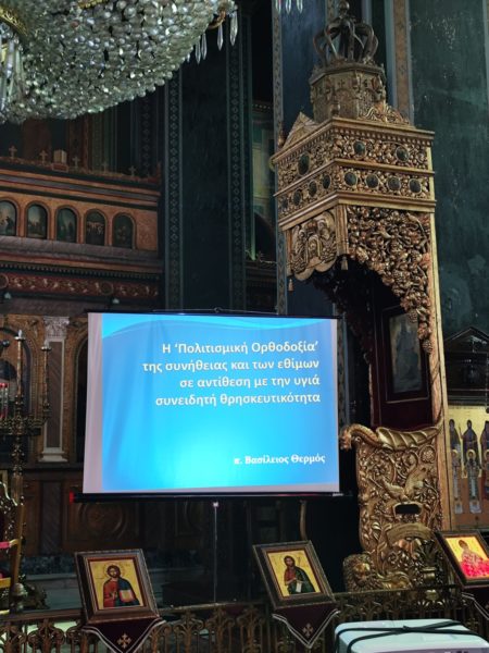 Προσκεκλημένος εισηγητής ήταν ο Πρωτοπρεσβύτερος π. Βασίλειος Θερμός, Αν. Καθηγητής της Ανωτάτης Εκκλησιαστικής Ακαδημίας Αθηνών – Ψυχίατρος παιδιών και εφήβων, ο οποίος ανέπτυξε το θέμα: «Η πολιτισμική Ορθοδοξία της συνήθειας και των εθίμων σε αντίθεση με την υγιά συνειδητή θρησκευτικότητα».