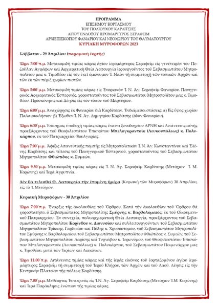 Πανηγυρίζει το Σάββατο 29 Απριλίου και την Κυριακή (των Μυροφόρων) 30 Απριλίου η πόλη της Καρδίτσης και η Ιερά Μητρόπολη Θεσσαλιώτιδος και Φαναριοφερσάλων, τιμώντας όπως κάθε χρόνο, τον Άγιο και προστάτη της ιερομάρτυρα Σεραφείμ.
