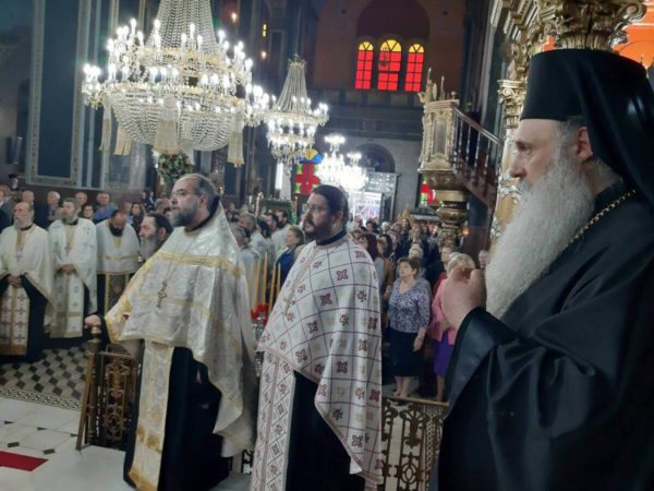 Η Λιτανευτική πομπή, στη συνέχεια, κατευθύνθηκε στον Ιερό Μητροπολιτικό Ναό Αγίων Κωνσταντίνου και Ελένης, όπου και τελέστηκε Πανηγυρικός Εσπερινός, χοροστατούντος του Σεβασμιωτάτου Μητροπολίτου Γόρτυνος και Μεγαλοπόλεως κ. Νικηφόρου.