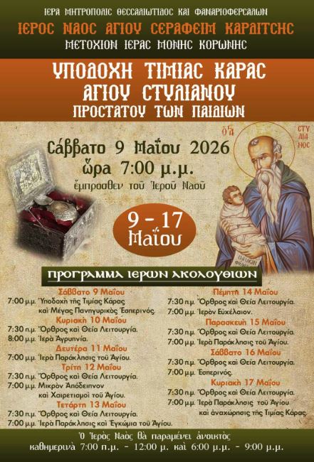 Η πόλη της Καρδίτσας και συγκεκριμένα ο Ιερός Ναός Αγίου Σεραφείμ (Μετόχι της Ιεράς Μονής Κορώνης) θα έχει την μεγάλη ευλογία να υποδεχθεί την Τιμία Κάρα του Αγίου Στυλιανού, προστάτου των παιδιών.