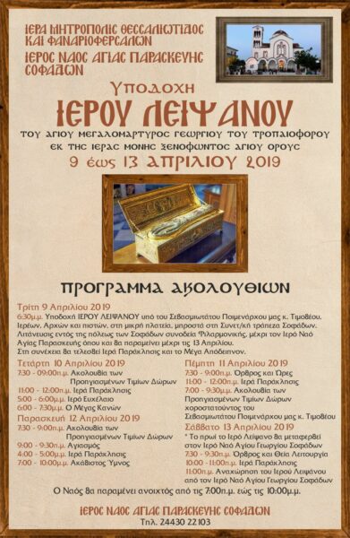Μεγάλες θρησκευτικές στιγμές θα βιώσουν οι πιστοί στους Σοφάδες Καρδίτσης αφού την Τρίτη 9 Απριλίου και ώρα 6:30΄μ.μ., θα υποδεχθούν τεμάχιο του ιερού λειψάνου του αγίου και ενδόξου μεγαλομάρτυρος Γεωργίου του τροπαιοφόρου εκ της Ιεράς Μονής Οσίου Ξενοφώντος Αγίου Όρους. Η υποδοχή, με επικεφαλής τον επιχώριο Μητροπολίτη Θεσσαλιώτιδος και Φαναριοφερσάλων κ. Τιμόθεο, θα λάβει χώρα στη μικρή πλατεία έναντι της Συνεταιριστικής Τραπέζης και θα ακολουθήσει Λιτανευτική πομπή μέχρι τον Ιερό Ναό Αγίας Παρασκευής.