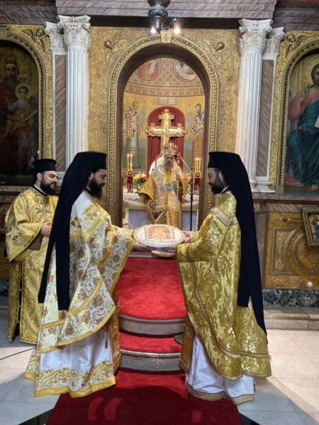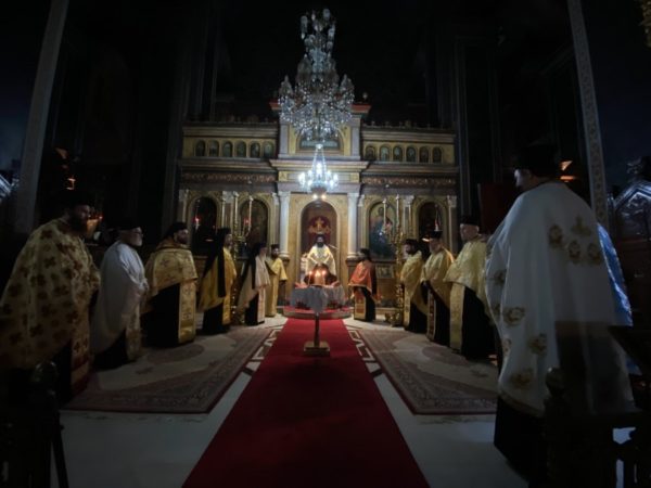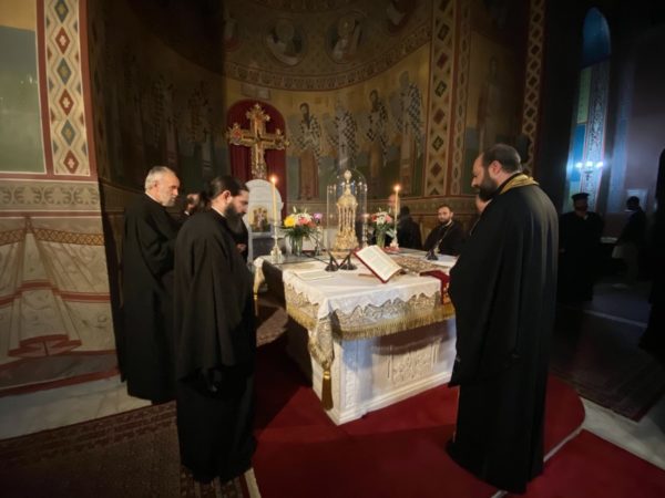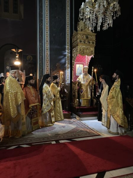Κατά την ακολουθία του Εσπερινού προέστη ο Πανοσιολογιώτατος Αρχιμανδρίτης π. Αμφιλόχιος Παπανδρέου, Πρωτοσύγκελλος της Ιεράς μας Μητροπόλεως, ο οποίος ήγαγε τα ονομαστήριά του.