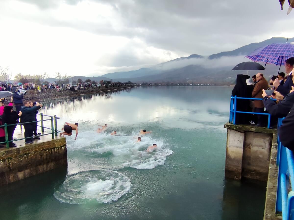 Εννέα τολμηροί κολυμβητές βούτηξαν στα παγωμένα νερά της λίμνης, προκειμένου να ανασύρουν τον Τίμιο Σταυρό και να λάβουν την ευλογία.