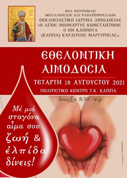 Το Εκκλησιαστικό Ίδρυμα Αιμοδοσίας “ο Άγιος Νεομάρτυς Κωνσταντίνος ο εν Καππούα (Κάππα) Καρδίτσης Μαρτυρήσας” της Ιεράς Μητροπόλεως Θεσσαλιώτιδος και Φαναριοφερσάλων οργανώνει εθελοντική αιμοδοσία την Τετάρτη 18 Αυγούστου 2021 στο Πολιτιστικό Κέντρο της Τοπικής Κοινότητας Κάππα από τις 8:30 το πρωί.