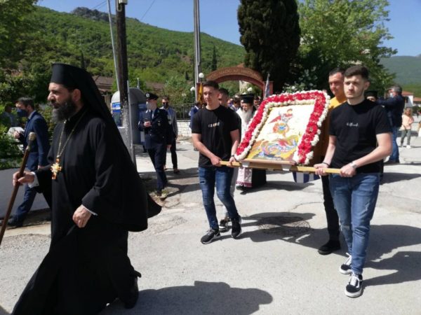 Ακολούθως, προέστη της Λιτανείας της εικόνος του Αγίου Γεωργίου του τροπαιοφόρου μέχρι την κεντρική πλατεία του Τ.Κ. Μαυρομματίου, όπου και τέλεσε επιμνημόσυνο δέηση ενώπιον του έφιππου ανδριάντα του οπλαρχηγού της Ελληνικής Επαναστάσεως Γεωργίου Καραϊσκάκη.