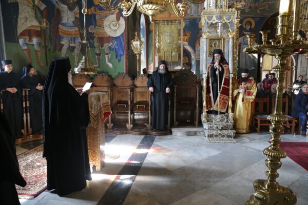 Την επόμενη ημέρα, Σάββατο 22 Φεβρουαρίου, προεξήρχε της Θείας Ευχαριστίας, κατά τη διάρκεια της οποίας ο Καθηγούμενος, αρχιμ. Αλέξιος, ετέλεσε την εις Μεγαλόσχημον Μοναχόν κουρά του αδελφού της Ιεράς Μονής, Μοναχού Μακαρίου. Ακολούθησε εόρτια Τράπεζα και κέρασμα στο Συνοδικό, όπου ο Σεβασμιώτατος ομίλησε επίκαιρα και εξήρε το μοναχικό πολίτευμα.