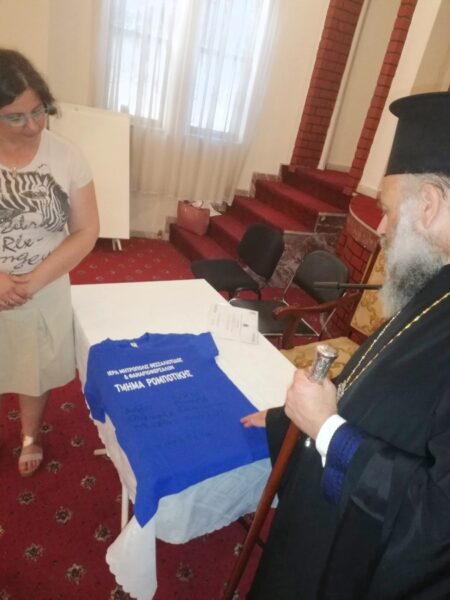 Ως ένδειξη ευγνωμοσύνης, οι μικροί μαθητές, έδωσαν στον Μητροπολίτη, μία αναμνηστική μπλούζα με τον λογότυπο της ομάδας “Άξιον Εστί” την οποία και υπέγραψαν!