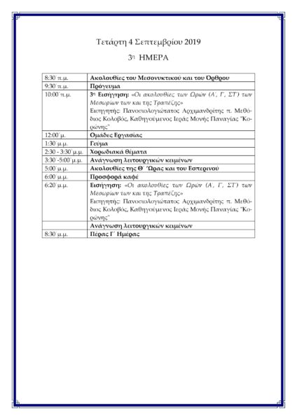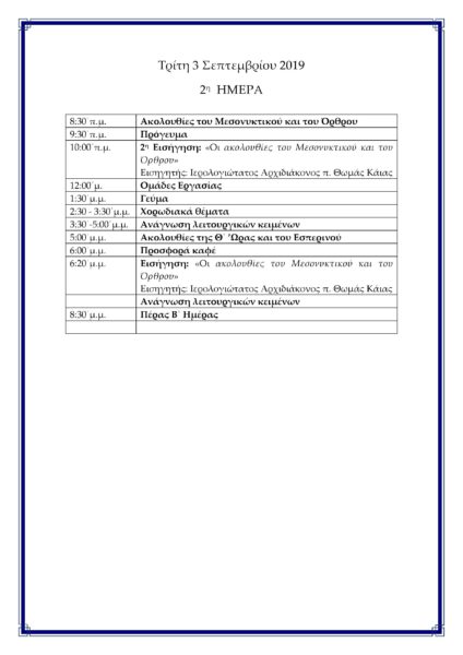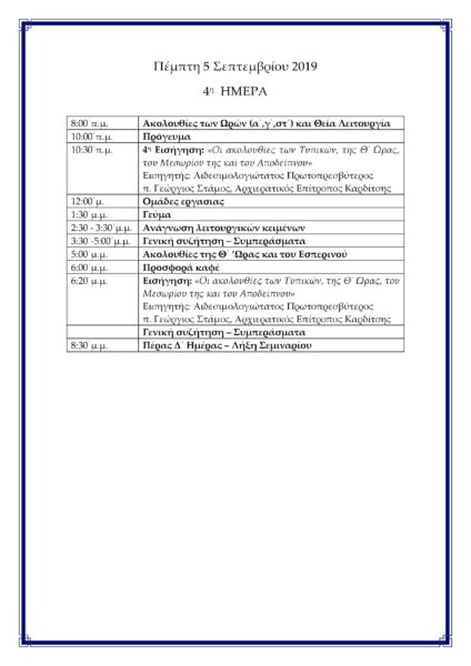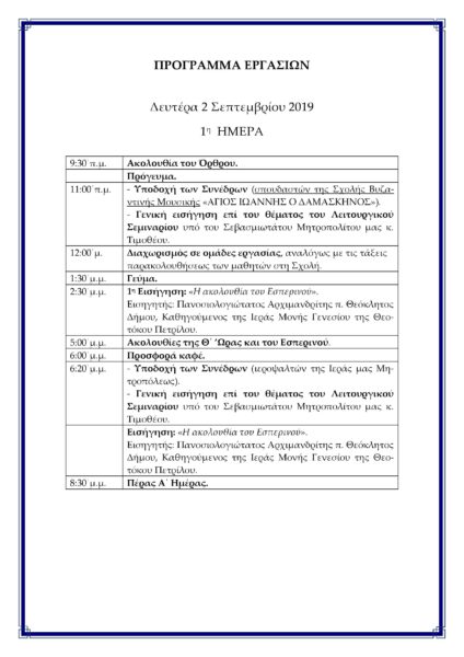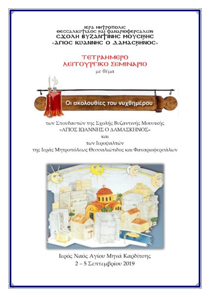 Τετραήμερο Λειτουργικό Σεμινάριο με θέμα “ΟΙ ΑΚΟΛΟΥΘΙΕΣ ΤΟΥ ΝΥΧΘΗΜΕΡΟΥ” των σπουδαστών της Σχολής Βυζαντινής Μουσικής και των ιεροψαλτών της Ιεράς Μητροπόλεως Θεσσαλιώτιδος και Φαναριοφερσάλων, κατά τις 2-5 Σεπτεμβρίου 2019, συμφώνως με το αναλυτικό Πρόγραμμα, το οποίο επισυνάπτεται ευθύς παρακάτω: