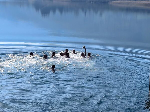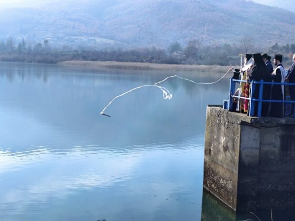 Ακολούθησε η τελετή του αγιασμού των υδάτων και της κατάδυσης του Τιμίου Σταυρού στην αναρρυθμιστική λίμνη, στην οποία ο Σεβασμιώτατος, έριξε στο νερό τον Τίμιο Σταυρό, τον οποίο έσπευσαν να ανασύρουν δέκα κολυμβητές.
