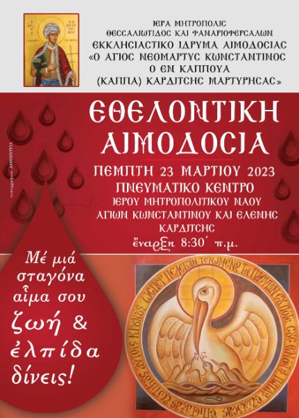 Κατά την συνεδρία του Διοικητικού Συμβουλίου του Εκκλησιαστικού Ιδρύματος Αιμοδοσίας στις 22 Φεβρουαρίου αποφασίσθηκε να γίνει η ενδεκάτη αιμοληψία την Πέμπτη 23 Μαρτίου 2023 και από ώρα 8:30’ το πρωί στο Πνευματικό Κέντρο δίπλα στον Ιερό Μητροπολιτικό Ναό των Αγίων Κωνσταντίνου και Ελένης Καρδίτσης.