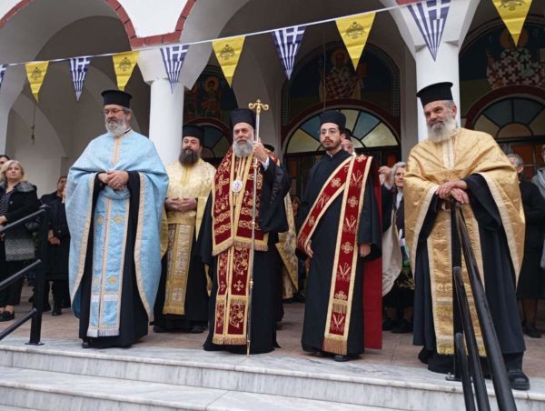Ο Σεβασμιώτατος στην ομιλία του ανέφερε: “Η εορτή των Εισοδίων, της εισόδου δηλαδή της Κυρίας Θεοτόκου της Μαρίας εν τω Ναώ του Σολομώντος, είναι η δεύτερη εκκλησιαστική εορτή του εκκλησιαστικού έτους. Η πρώτη Θεομητορική εορτή ήταν τον Σεπτέμβριο με το Γενέσιο της Παναγίας μας και η δεύτερη που αρχίζει η 1η Σεπτεμβρίου, το εκκλησιαστικό έτος και η δεύτερη Θεομητορική εορτή είναι η αποψινή και αυριανή και μέχρι την 25η Νοεμβρίου, όπου θα ψάλλουμε μέσα στους ναούς μας, προς το πρόσωπο της Κυρίας Θεοτόκου για την είσοδό της εις τον Ναό του Σολομώντος. Ήδη από την Γέννηση της Θεοτόκου για την σωτηριώδη οικονομία του ανθρώπου, για τη σωτηρία του δηλαδή, έχει ξεκινήσει θα λέγαμε η αντίστροφος μέτρησης. Διότι με την γέννηση της Παναγίας ζωγραφίζεται η έλευση του Ιησού Χριστού εις τον κόσμο. Διότι από εκείνην, όπως γνωρίζουμε όλοι μας, γεννήθηκε ο Υιός και Λόγος του Θεού. Η εορτή των Εισοδίων της Θεοτόκου όμως, είναι αυτή, η οποία μας προετοιμάζει και μας προμηνύει και μας προκαταγγέλει την γέννηση του Ιησού Χριστού. Γι’ αυτό και από αύριο το πρωί στην ακολουθία του Όρθρου θα ξεκινήσουμε να ψάλλουμε τις Καταβασίες των Χριστουγέννων, «Χριστός γεννάται! Δοξάσατε». Και για να γίνει πιο αντιληπτό σε όλους μας, αυτή η θεολογία της Εκκλησίας γύρω από το πρόσωπο της Παναγίας Μητέρας του Κυρίου, σας διαβεβαιώ ότι ο καλύτερος οδηγός είναι το απολυτίκιο της εορτής που θα ψάλλουμε ευθύς αμέσως πριν τελειώσουμε την ακολουθία του Εσπερινού. Και θα προσπαθήσουμε, ακολουθώντας μερικές λέξεις, θα τολμούσα να πω, κλειδιά να κατανοήσουμε την θεολογία της εορτής των Εισοδίων της Παναγίας μας. Θα ψάλλουμε λοιπόν ευθύς μετ’ ολίγου το απολυτίκιο της, το οποίον λέγει «Σήμερον της ευδοκίας Θεού το προοίμιον, και της των ανθρώπων σωτηρίας η προκήρυξις. Εν ναώ του Θεού τρανώς η Παρθένος δείκνυται, και τον Χριστόν τοις πάσι προκαταγγέλλεται. Αυτή και ημείς μεγαλοφώνως βοήσωμεν˙ Χαίρε της οικονομίας του Κτίστου η εκπλήρωσις».
