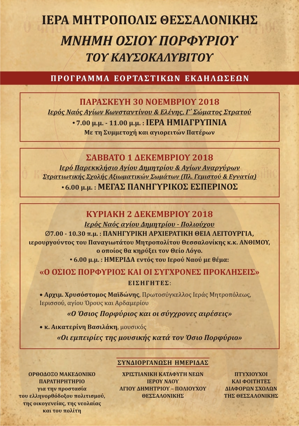 Το απόγευμα της ίδιας ημέρας και συγκεκριμένα στης 6 μ.μ., εντός του Ναού του Αγίου Δημητρίου, θα πραγματοποιηθεί Ημερίδα με θέμα Ο ΟΣΙΟΣ ΠΟΡΦΥΡΙΟΣ ΚΑΙ ΟΙ ΣΥΓΧΡΟΝΕΣ ΠΡΟΚΛΗΣΕΙΣ, με ομιλητές, τον Πρωτοσύγκελλο της Μητροπόλεως Ιερισσού, Αγίου Όρους και Αρδαμερίου Πατέρα Χρυσόστομο Μαιδώνη, με θέμα << Ο Όσιος Πορφύριος και οι σύγχρονες αιρέσεις>> και την κ.Αικατερίνη Βασιλάκη, μουσικό, με θέμα << Οι εμπειρίες της μουσικής κατα τον Όσιο Πορφύριο>>.