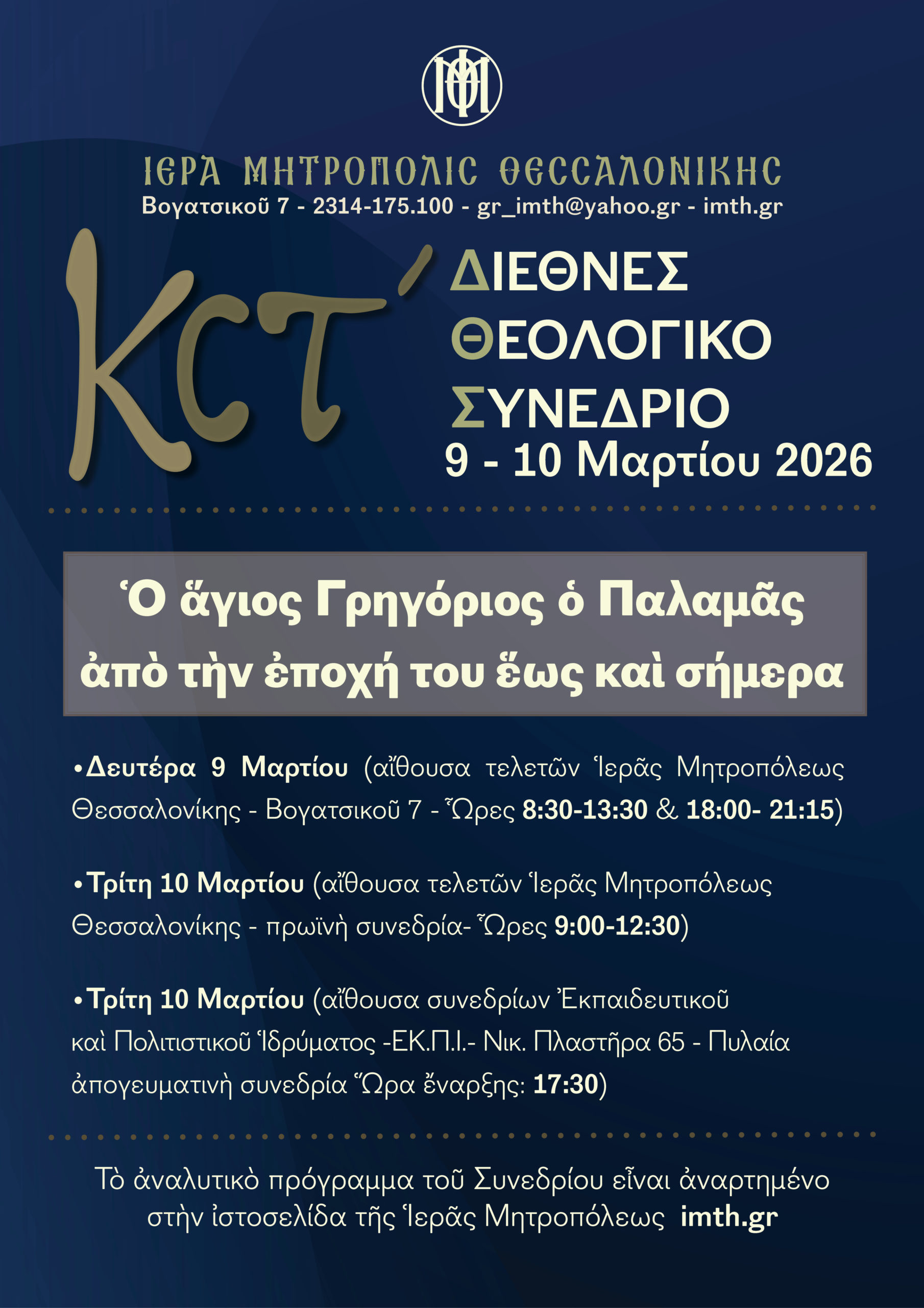 Το Συνέδριο θα ευλογήσει με την παρουσία του ο Ποιμενάρχης, Μητροπολίτης Θεσσαλονίκης κ. Φιλόθεος και οι εργασίες του θα διεξαχθούν, από το πρωί της Δευτέρας 9ης Μαρτίου μέχρι και το μεσημέρι της επομένης, Τρίτης 10ης Μαρτίου, στην αίθουσα εκδηλώσεων της Μητροπόλεώς μας (Βογατσικού 7).