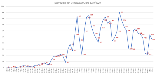 Χαρακτηριστικό τῆς εἰκόνας ποὺ εἶχε ΗΔΗ δημιουργηθεῖ στὴν πόλη καὶ τῆς πορείας τῆς ἀσθένειας, ποὺ ΗΔΗ βρισκόταν σὲ φάση ἐκθετικῆς αὔξησης εἶναι ὅτι σύμφωνα μὲ δημοσίευμα τῆς 22ας Ὀκτωβρίου «Σοκάρει η αύξηση 500% στο ιικό φορτίο των λυμάτων της Θεσσαλονίκης», μὲ ἄλλο δημοσίευμα τῆς 24ης Ὀκτωβρίου «ενδεικτική είναι η ραγδαία αύξηση των κρουσμάτων στη Θεσσαλονίκη όπου πλέον εκεί διαμένει τουλάχιστον ένας στους πέντε φορείς του επικίνδυνου ιού, σε όλη την Ελλάδα. Το ποσοστό της συμπρωτεύουσας προ 20ημέρου είχε κατέλθει στο 3-5% αυτών όλης της Ελλάδας (το καλοκαίρι ήταν της τάξης του 17%). Κι από τότε υπάρχει ραγδαία άνοδος με το 51% των ενεργών κρουσμάτων στη συμπρωτεύουσα να είναι ηλικίας 18 έως 29 ετών, όπως επεσήμανε χθες στην συνέντευξη Τύπου ο υφυπουργός Πολιτικής Προστασίας κ Νίκος Χαρδαλιάς», ἐνῶ σὲ ἄλλο δημοσίευμα, ποὺ ἀπέχει χρονικὰ δύο ἑβδομάδες ἀπὸ τὴν 26/10 (χρονικό διάστημα τὸ ὁποῖο σύμφωνα μὲ τοὺς εἰδικοὺς ἀπαιτεῖται γιὰ τὴν ἐκδήλωση τῶν ἀποτελεσμάτων διασπορᾶς τοῦ ἰοῦ), γίνεται μεν μία ἀπόπειρα σύνδεσης μὲ τοὺς ἑορτασμοὺς τοῦ ἁγίου Δημητρίου («στο τριήμερο των εορτασμών της πόλης καταγράφονται φαινόμενα συνωστισμού»), ἀλλὰ καθὼς καταγράφονται ἀριθμητικὰ τὰ κρούσματα στὴν πόλη, ἐμφανίζεται μικρὴ πτώση δύο ἑβδομάδες μετὰ τὴν 26/10: [Τὰ στοιχεῖα ποὺ παρατίθενται, συλλέχθηκαν ἀπὸ τὸ συγκεκριμένο ἄρθρο καὶ δύο σχετικοὺς πίνακες, ὅπου ὁ ἐνδιαφερόμενος μπορεῖ νὰ ἐξετάσει τὴν πορεία τῶν κρουσμάτων στὴν πόλη μας ἀναλυτικὰ, γιὰ τὸ διάστημα 1η Ὀκτωβρίου ἔως 2α Δεκεμβρίου(εἰκ.1 ) καὶ συγκεντρωτικὰ γιὰ τὸν μῆνα Νοέμβριο(εἰκ. 2)]: