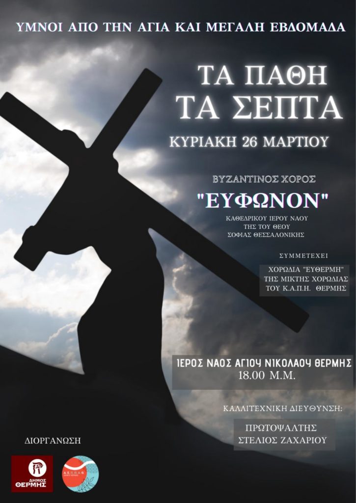 Μουσικό οδοιπορικό με βυζαντινούς – εκκλησιαστικούς ύμνους και αφηγήσεις για την Αγία και Μεγάλη εβδομάδα με τίτλο: «Τα πάθη τα σεπτά» θα πραγματοποιηθεί την Κυριακή 26 Μαρτίου 2023 και ώρα 18:00 μ.μ. στον Ιερό Ναό Αγίου Νικολάου Θέρμης.