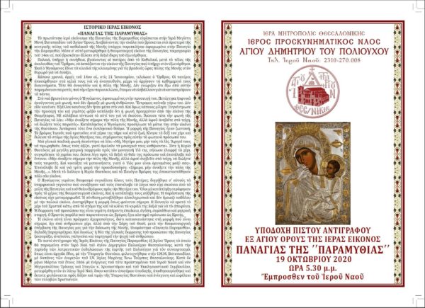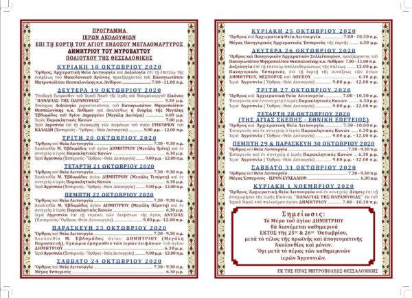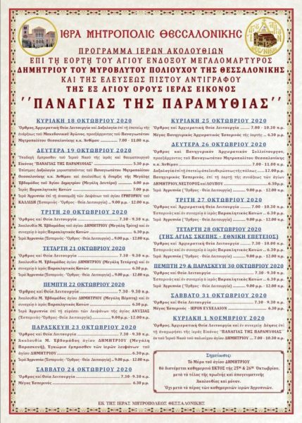 Ξεκινάνε τα “Δημήτρια” για τους φετινούς πανηγυρικούς εορτασμούς στην Ιερά Μητρόπολη Θεσσαλονίκης από την Κυριακή 18 Οκτωβρίου. Ο Άγιος Δημήτριος είναι ο πολιούχος της πόλεως ενώ για τους φετινούς εορτασμούς θα πραγματοποιηθεί και η υποδοχή πιστού αντιγράφου εξ Αγίου Όρους της Ιεράς Εικόνος της Παναγίας της “Παραμυθίας” ενώ το μύρο του Αγίου Δημητρίου του Μυροβλήτη θα διανέμεται καθημερινά μέχρι τις 24 Οκτωβρίου.