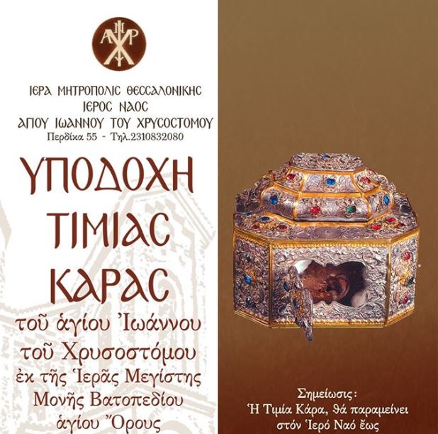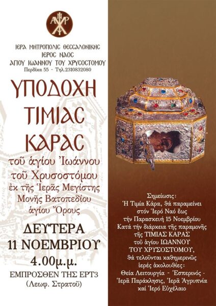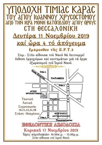 Ἐνημερώνομε ὅλους τοὺς εὐσεβεῖς Χριστιανούς, ὅτι αὔριο, Δευτέρα 11 Νοεμβρίου 2019, στὶς 4.00 τὸ ἀπόγευμα θὰ γίνῃ ἡ ὑποδοχὴ τῆς τιμίας Κάρας τοῦ ἁγίου Ἰωάννου τοῦ Χρυσοστόμου, Ἀρχιεπισκόπου Κωνσταντινουπόλεως, στὴ συμβολὴ τῶν ὁδῶν Λεωφ. Στρατοῦ καὶ Καυτατζόγλου, ἔμπροσθεν τῆς ΕΡΤ3. Ἡ τιμία κάρα θα μεταφερθῇ ἀπὸ τὴν ἱερὰ Μεγίστη Μονὴ Βατοπαιδίου ἁγίου Ὄρους καὶ ἀκολούθως θὰ πραγματοποιηθῇ ἡ λιτάνευσίς της στὶς ὁδοὺς Λεωφ. Στρατοῦ, Παπαναστασίου καὶ Ἀλ. Συμεωνίδη.