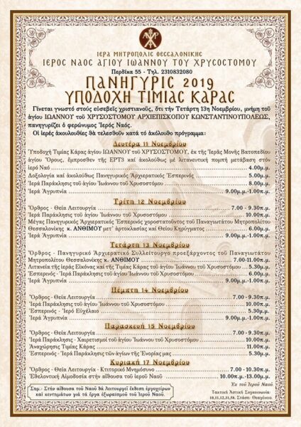 Η ΤΙΜΙΑ ΚΑΡΑ ΤΟΥ ΑΓΙΟΥ ΙΩΑΝΝΟΥ ΤΟΥ ΧΡΥΣΟΣΤΟΜΟΥ ΣΤΟΝ ΟΜΩΝΥΜΟ ΙΕΡΟ ΕΝΟΡΙΑΚΟ ΝΑΟ ΤΗΣ ΙΕΡΑΣ ΜΗΤΡΟΠΟΛΕΩΣ ΘΕΣΣΑΛΟΝΙΚΗΣ (11 εως 15 Νοεμβρίου).