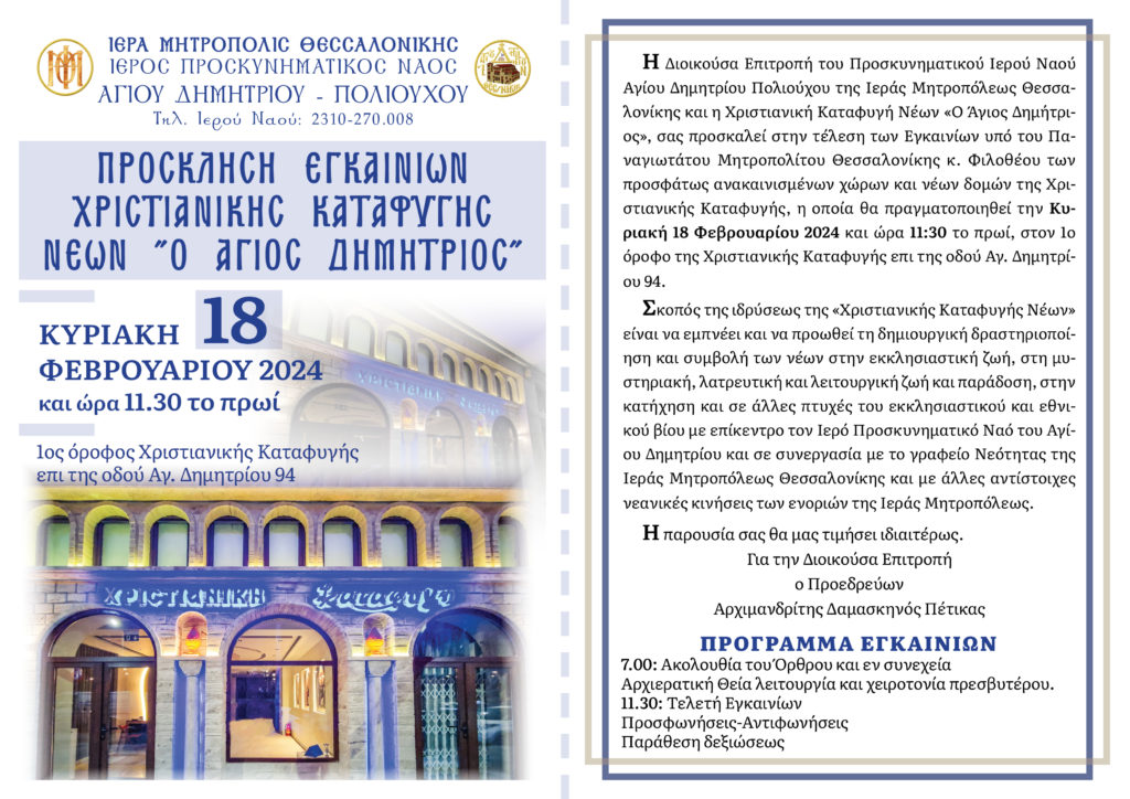 Σήμερα, η Διοικούσα Επιτροπή του Προσκυνηματικού Ιερού Ναού Αγίου Δημητρίου Πολιούχου της Ιεράς Μητροπόλεως Θεσσαλονίκης και η Χριστιανική Καταφυγή Νέων «Ο Άγιος Δημήτριος», βρίσκεται στην εξαιρετικά ευχάριστη θέση, να ανακοινώσει στους συμπολίτες μας και ιδιαίτερα στους νέους της Θεσσαλονίκης ότι, την προσεχή Κυριακή 18 Φεβρουαρίου 2024 και ώρα 11:30 το πρωί, στον 1ο όροφο της Χριστιανικής Καταφυγής επί της οδού Αγ. Δημητρίου 94, θα τελεστούν από τον Παναγιώτατο Μητροπολίτη Θεσσαλονίκης κ. Φιλόθεο τα Εγκαίνια των προσφάτως ανακαινισμένων χώρων και νέων δομών της Χριστιανικής Καταφυγής.