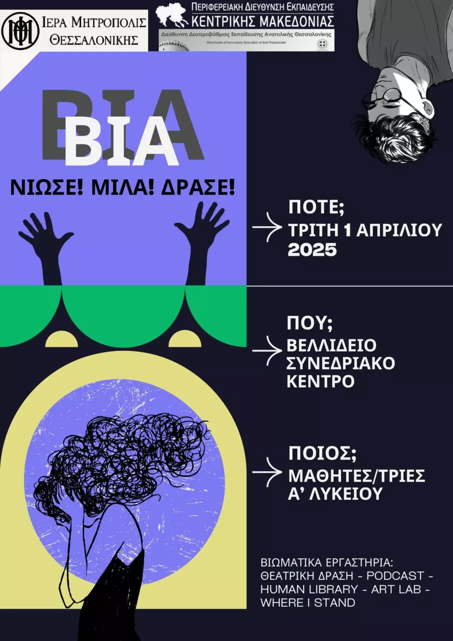 Η Ιερά Μητρόπολη Θεσσαλονίκης σε συνεργασία με την Περιφερειακή Διεύθυνση Πρωτοβάθμιας και Δευτεροβάθμιας Εκπαίδευσης Κεντρικής Μακεδονίας και τη Διεύθυνση Δευτεροβάθμιας Εκπαίδευσης Ανατολικής Θεσσαλονίκης, διοργανώνουν για 2η συνεχόμενη χρονιά την Εκπαιδευτική Εκδήλωση κινητοποίησης κατά της βίας, με τίτλο «Βία: Νιώσε! Μίλα! Δράσε!», η οποία θα πραγματοποιηθεί την Τρίτη, 1 Απριλίου 2025 και ώρες 9:00 π.μ. – 2:00 μ.μ., στο Βελλίδειο Συνεδριακό Κέντρο.