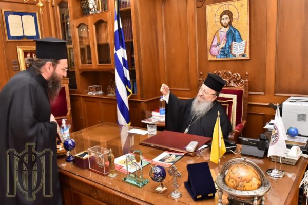 Τέλος, ο Παναγιώτατος κ. Άνθιμος δέχθηκε σε ακρόαση τον Πανοσιολ. Αρχιμανδρίτη π. Βαρθολομαίο Αντωνίου – Τριανταφυλλίδη, τον οποίο και συνεχάρη για το ευθυνοφόρο έργο, το οποίο του ανέθεσε ο Μακαριώτατος Αρχιεπίσκοπος Αθηνών και πάσης Ελλάδος κ. Ιερώνυμος, σχετικώς με την προετοιμασία και την υλοποίηση των διαφόρων επετειακών εκδηλώσεων και ομιλιών ανά την ελληνική Επικράτεια με αφορμή την συμπλήρωση των 200 ετών από την κήρυξη της Ελληνικής Επαναστάσεως.
