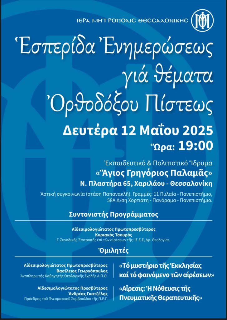 Η Ιερά Μητροπόλη Θεσσαλονίκης, διά του Γραφείου Ενημέρωσεως επί των Αιρέσεων, διοργανώνει «Εσπερίδα Ενημέρωσης για θέματα Ορθοδόξου Πίστεως», η οποία θα πραγματοποιηθεί την Δευτέρα 12 Μαϊου και ώρα 7:00 μ.μ, στο Εκπαιδευτικό και Πολιτιστικό Ίδρυμα «Άγιος Γρηγόριος Παλαμάς», Ν. Πλαστήρα 65, περιοχή Χαριλάου.