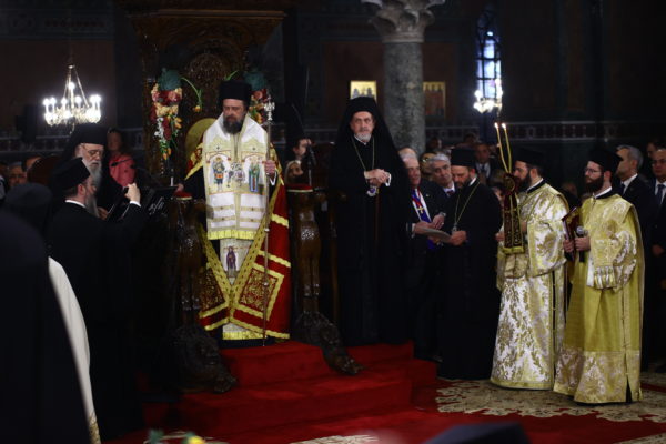 Ο Σεβασμιώτατος Μητροπολίτης Νεαπόλεως και Σταυρουπόλεως κ. Βαρνάβας, ως αναπληρωτής Τοποτηρητής, επέδωσε στον νέο Μητροπολίτη Θεσσαλονίκης, την ποιμαντορική ράβδο ευθύνης, για το νέο του ξεκίνημα. Εκπρόσωπος του Οικουμενικού Πατριαρχείου ήταν ο Σεβασμιώτατος Μητροπολίτης Γέρων Χαλκηδόνος κ. Εμμανουήλ, ως πνευματικός πατέρας, του έδωσε ακόμη μια ευχή για το νέο του ξεκίνημα, ενώ ο Μητροπολίτης πρώην Θεσσαλονίκης κ. Άνθιμος βρισκόταν από νωρίς στον ναό της Του Θεού Σοφίας και στάθηκε στο πλάι του νέου Μητροπολίτη.