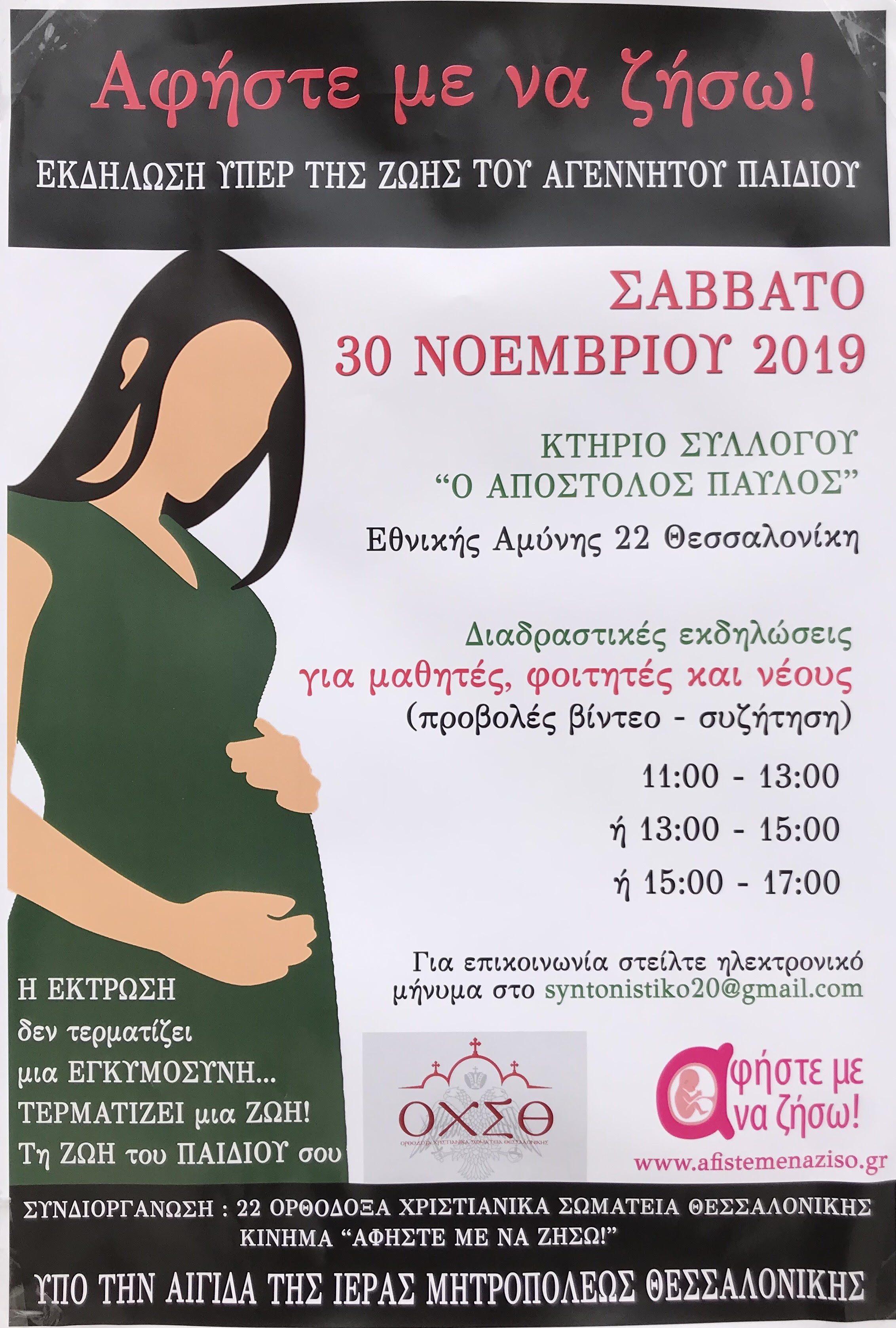 Εκδήλωση υπέρ της ζωής του αγέννητου παιδιού θα πραγματοποιηθεί το Σάββατο 30 Νοεμβρίου 2019 στο κτήριο του συλλόγου «ο Απόστολος Παύλος» Εθνικής Αμύνης 22.