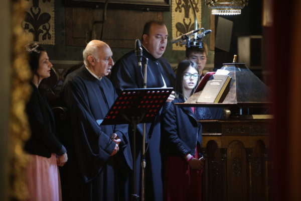 Τους ύμνους της θείας λειτουργίας απέδωσαν οι χοροί των ιεροψαλτών μαζί με τις χορωδίες τους, με προεξάρχοντα στον δεξιό χορό τον κ. Στυλιανό Ζαχαρίου και στον αριστερό τον κ. Χρήστο Τογκαρίδη.