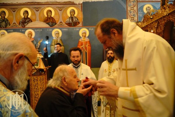 Προ της απολύσεως, ο Μητροπολίτης, απένειμε το χρυσό μετάλλιο του Αγίου Φιλοθέου, Αρχιεπισκόπου Θεσσαλονίκης, καθώς και τιμητική πλακέτα εκ μέρους του Εκκλησιαστικού Συμβουλίου, στον επί πεντηκονταετία ιεροψάλτη του ναού κ. Γεώργιο Μπερμπερίδη.