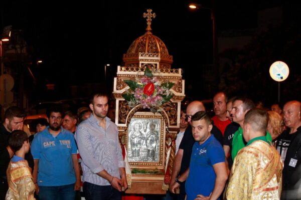 Εκατοντάδες πιστοί προσέτρεξαν στον Ιερό Ναό της Άνω πόλης για να προσκυνήσουν τα Λείψανα των Ιαματικών Αναργύρων και την Ιερή τους Εικόνα και να συμμετάσχουν στον πανηγυρικό Εσπερινό.