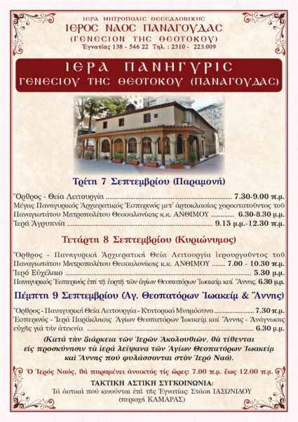 08/09/2021 08/09/2021 Με την ακολουθία του Μεγάλου Πανηγυρικού Εσπερινού του Γενεθλίου της Θεοτόκου άρχισε χθες, 7/9/2021, η γιορτή στον πανηγυρίζοντα Ιερό Ναό Παναγούδας Γοργϋπηκόου.  Τον Μακαριώτατο Μητροπολίτη Θεσσαλονίκης κ. Άνθιμο εκπροσώπησε ο Πανοσιολογιώτατος Αρχιμανδρίτης Φώτιος Ζαρζαβατσάκης, Γενικός Αρχιερατικός Επίτροπος. Το παρών έδωσαν από τις στρατιωτικές, πολιτικές και ακαδημαϊκές αρχές της πόλεως: εκπρόσωπος του Διοικητού του Γ’ Σώματος Στρατού, Αντιστρατήγου...