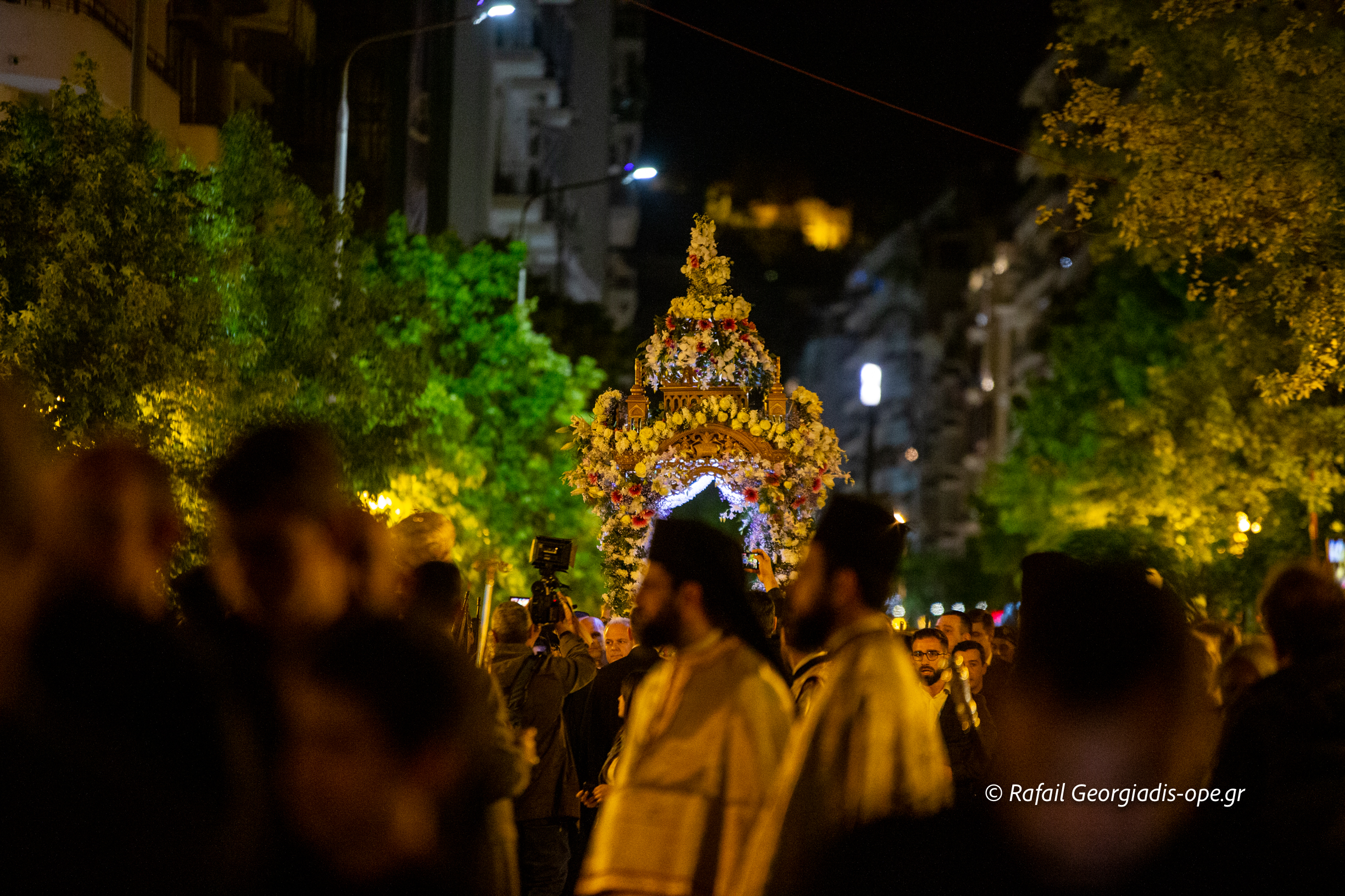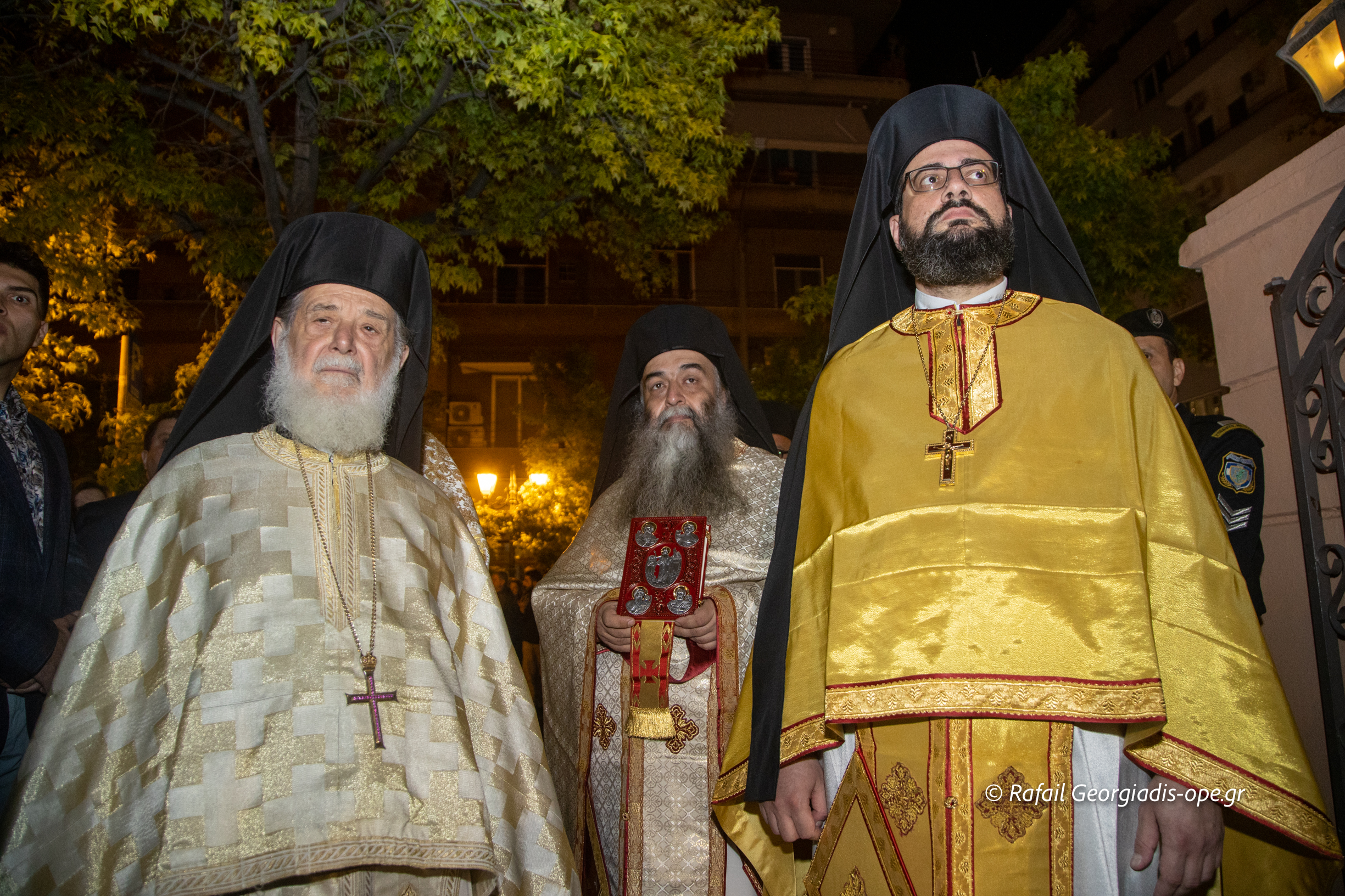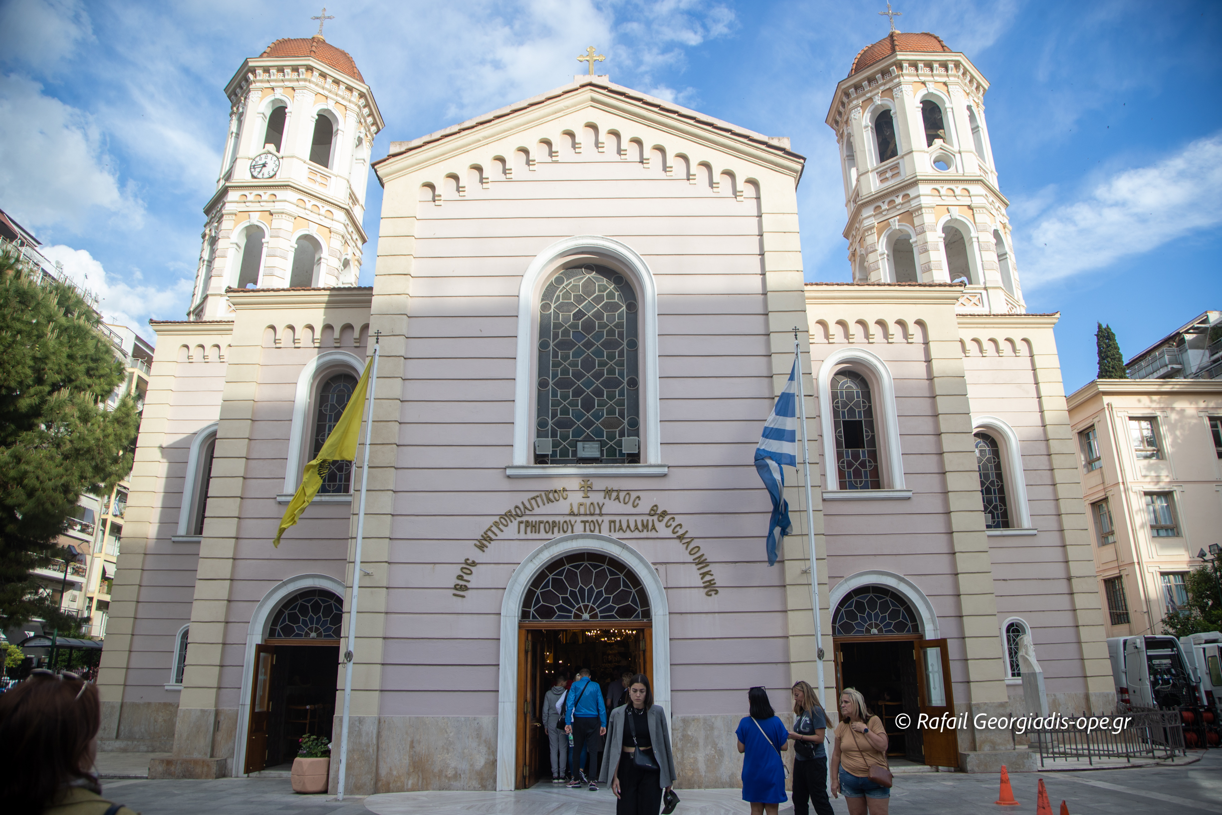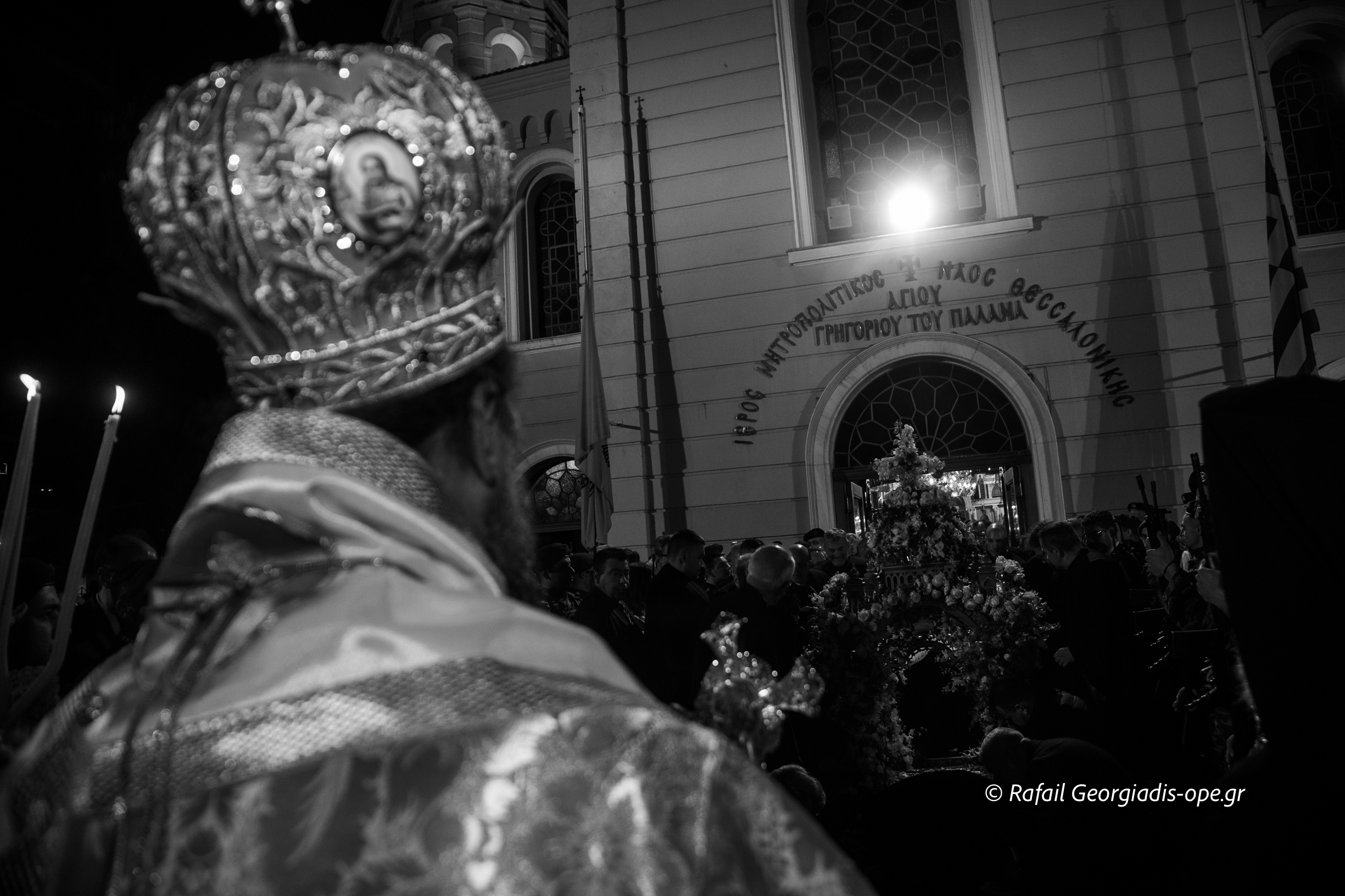Νωρίτερα, ο Παναγιώτατος Μητροπολίτης Θεσσαλονίκης χοροστάτησε στον Μητροπολιτικό Ιερό Ναό του Αγίου Γρηγορίου του Παλαμά κατά την Ακολουθία του Όρθρου του Μεγάλου Σαββάτου και ακολούθησε η περιφορά του Επιταφίου, με την συνοδεία της Φιλαρμονικής του Στρατού και στρατιωτικού αγήματος, διά των οδών: Αγίας Σοφίας – Λεωφ. Νίκης – πλ. Αριστοτέλους, για την πραγματοποίηση της συναντήσεως των Επιταφίων.