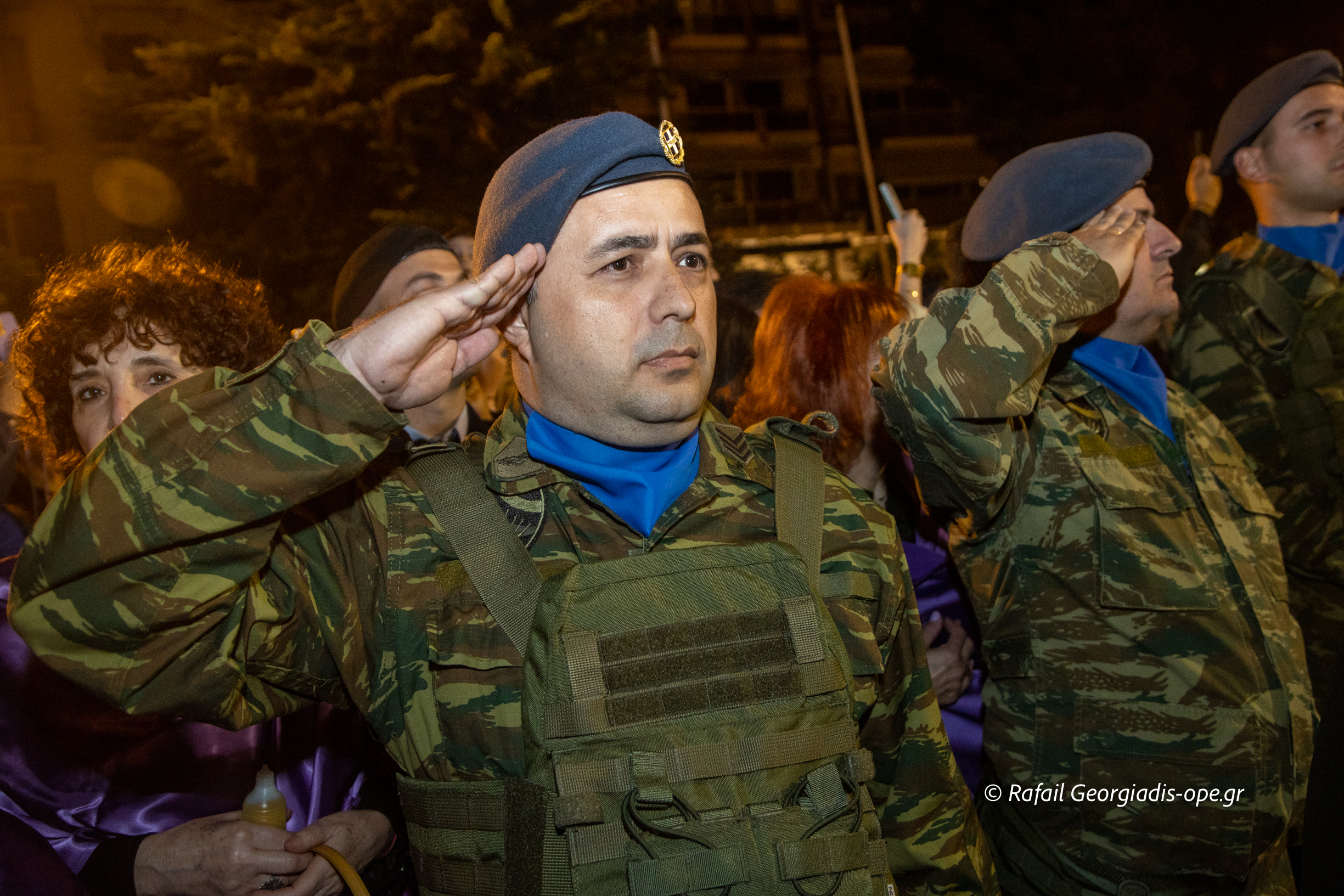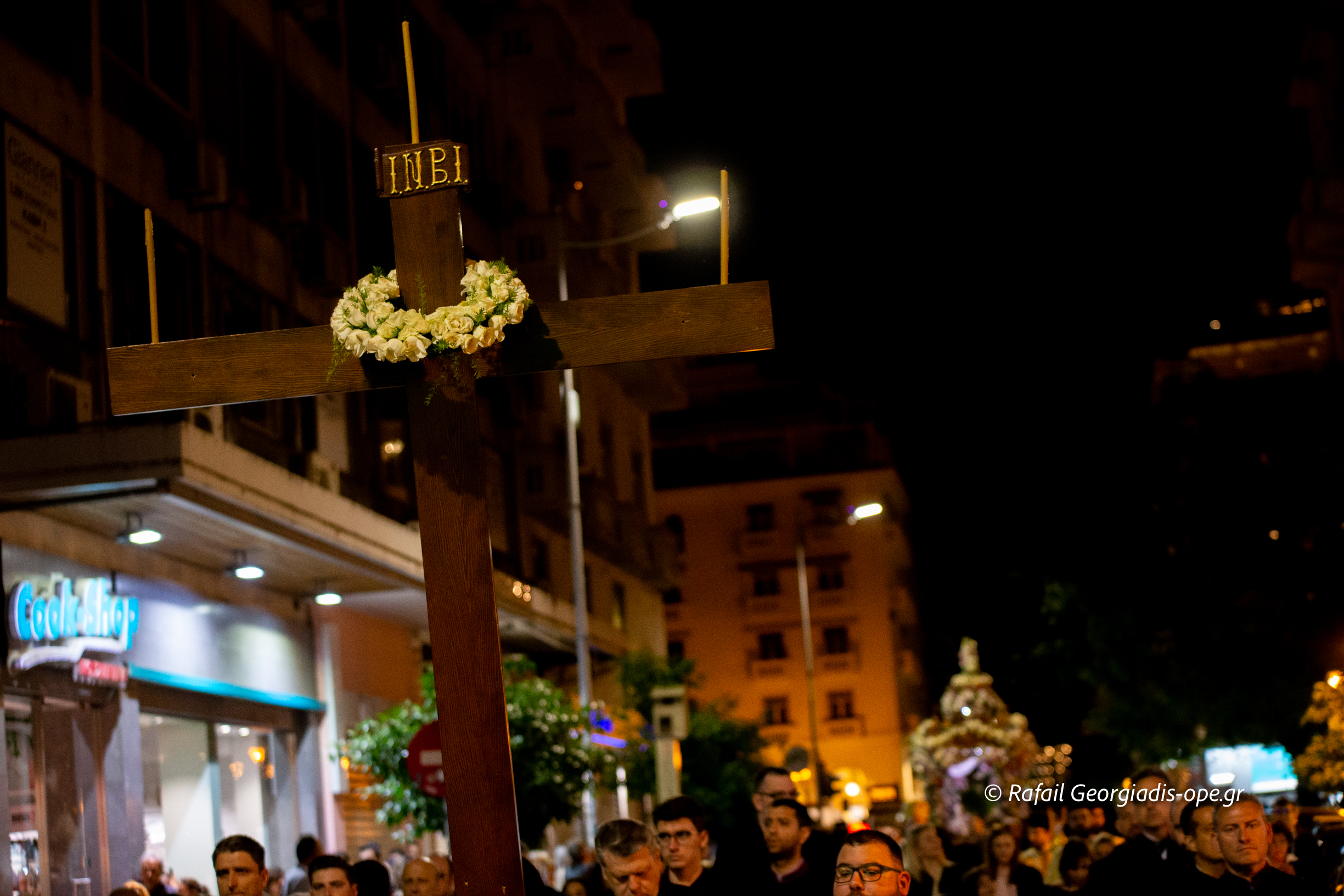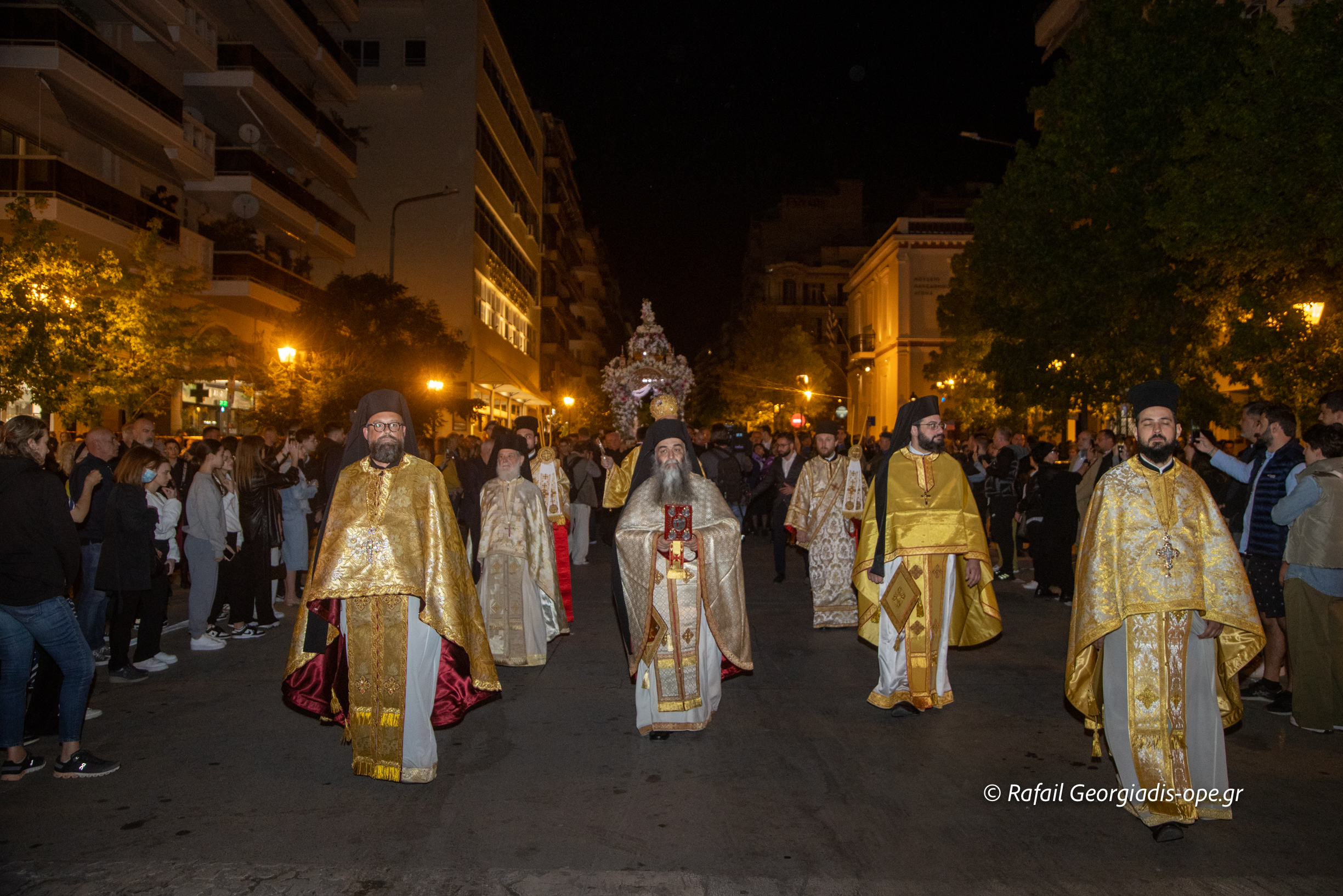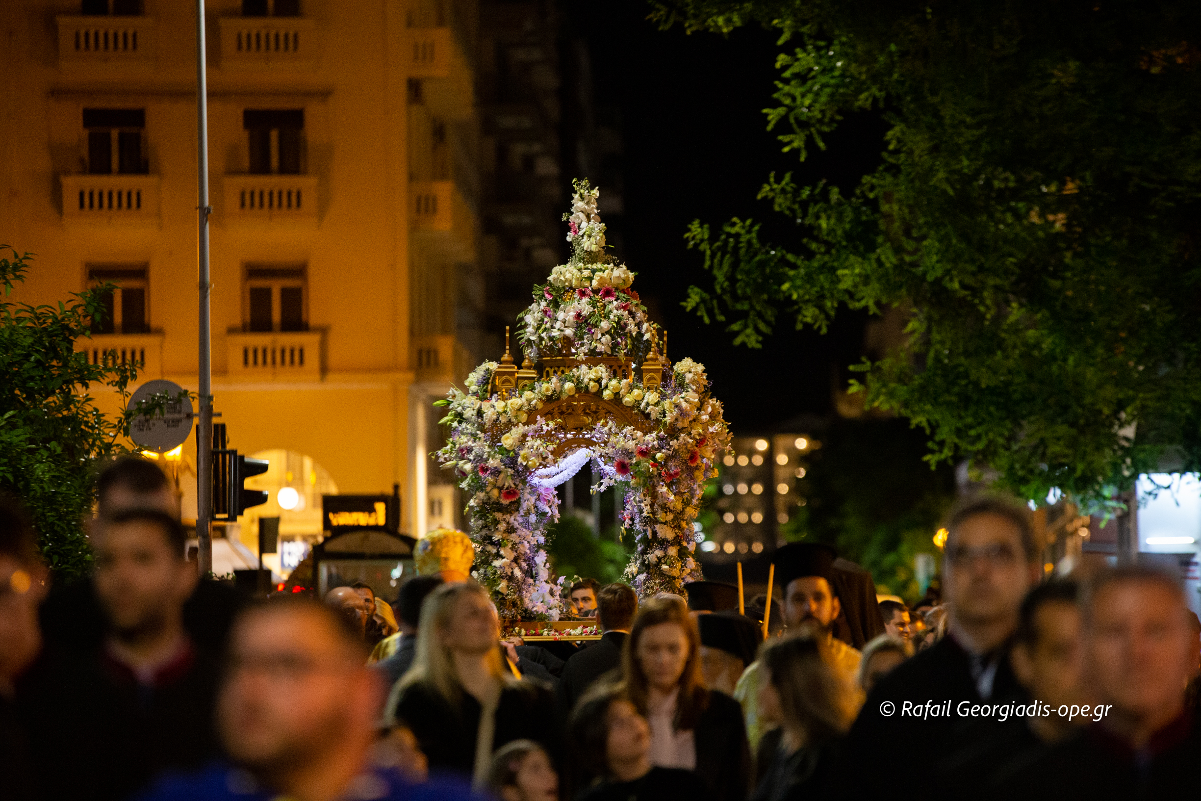 Νωρίτερα, ο Παναγιώτατος Μητροπολίτης Θεσσαλονίκης χοροστάτησε στον Μητροπολιτικό Ιερό Ναό του Αγίου Γρηγορίου του Παλαμά κατά την Ακολουθία του Όρθρου του Μεγάλου Σαββάτου και ακολούθησε η περιφορά του Επιταφίου, με την συνοδεία της Φιλαρμονικής του Στρατού και στρατιωτικού αγήματος, διά των οδών: Αγίας Σοφίας – Λεωφ. Νίκης – πλ. Αριστοτέλους, για την πραγματοποίηση της συναντήσεως των Επιταφίων.