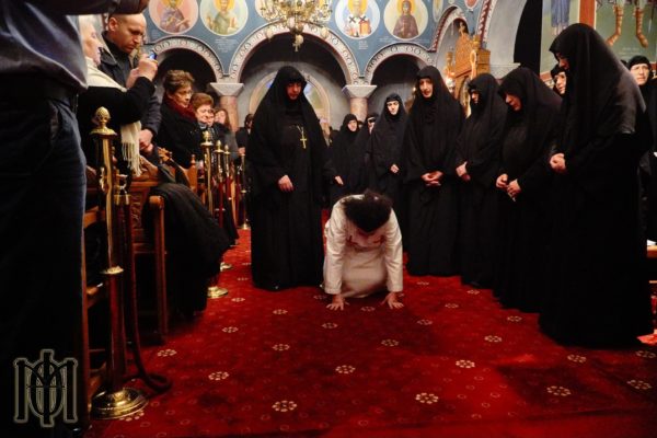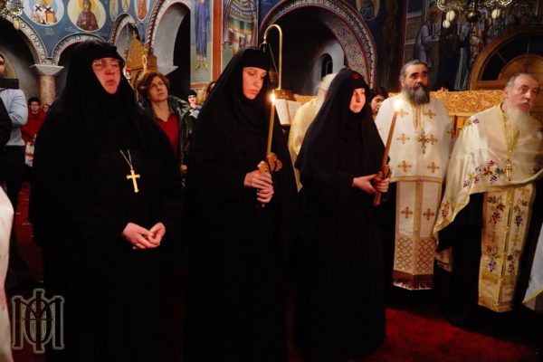 Ο Σεβασμιώτατος χοροστάστησε στην ακολουθία του Εσπερινού και ακολούθως τέλεσε την ακολουθία του Μεγάλου και Αγγελικού Σχήματος της αδελφής Ακυλίνας και εν συνεχεία τέλεσε την ακολουθία της ρασοευχής δοκίμου μοναχής της Ιεράς Μονής, η οποία και έλαβε το όνομα της Οσίας Θεοδώρας της εν Θεσσαλονίκη τη οποία και τιμά ιδιαιτέρως η Μητρόπολη.
