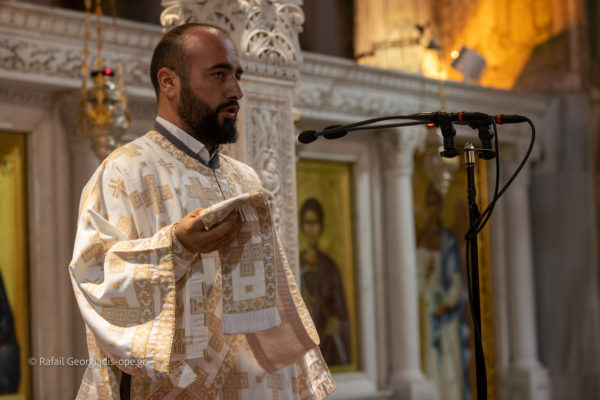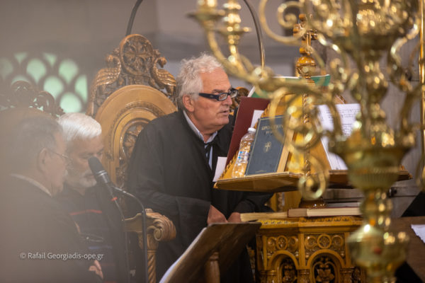 Το αναλόγιο του ιερού ναού λάμπρυναν με τις καλλικελαδες φωνές τους ο λαμπαδάριος του Ι.Ν. και διευθυντής της Σχολής της Βυζαντινής Μουσικής της Ι. Μητροπόλεως κ. Χαράλαμπος Τζινευράκης και η χορωδία του.