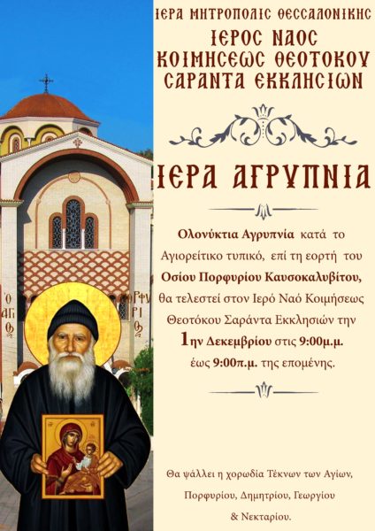 Ολονύκτια Αγρυπνία κατά το Αγιορείτικο τυπικό, επί τη εορτή του Οσίου Πορφυρίου Καυσοκαλυβίτου, θα τελεστεί στον Ιερό Ναό Κοιμήσεως Θεοτόκου Σαράντα Εκκλησιών την 1ην Δεκεμβρίου στις 9: 00 μ.μ. έως 9: 00 π.μ. της επομένης.