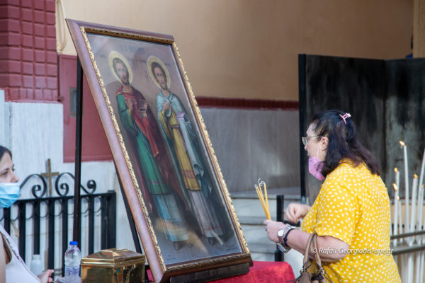 Πολλοί πιστοί συμμετείχαν στην ακολουθία και μετέπειτα στην λιτανεία που πραγματοποιήθηκε πέριξ του ναού με την φιλαρμονική μπάντα της Αστυνομίας να παιανίζει εμβατήρια. Παρά τον καύσωνα της ημέρας πολλοί ασθενείς προσέτρεξαν στους θεραπευτές αγίους προσευχόμενοι για το πολύτιμο αγαθό της υγείας.