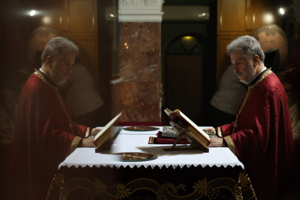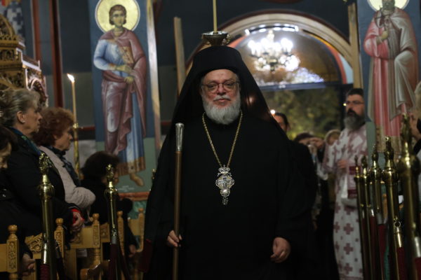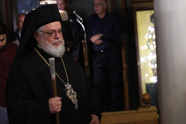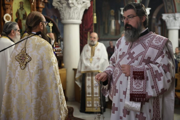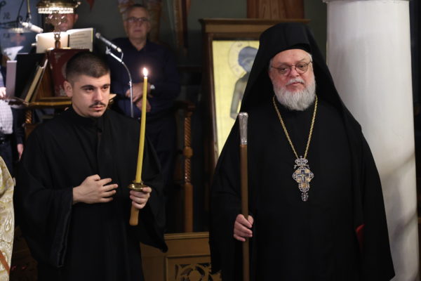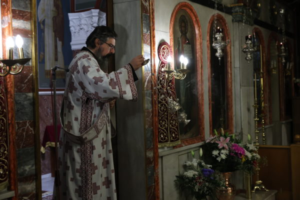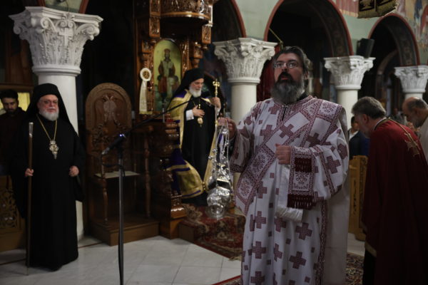 Στην ακολουθία του Εσπερινού χοροστάτησε, μετά από πρόσκληση του Παναγιωτάτου Μητροπολίτου Θεσσαλονίκης κ. Φιλοθέου, ο Θεοφιλέστατος Επίσκοπος Ρηγίου κ. Ειρηναίος, πλαισιούμενος από τον Ιεροκήρυκα αρχιμ. π. Κωνσταντίνο Φουντουκίδη, τον προϊσταμένο του ναού αρχιμ. Γρηγόριο Παπούλα, ιερείς και διακόνους.