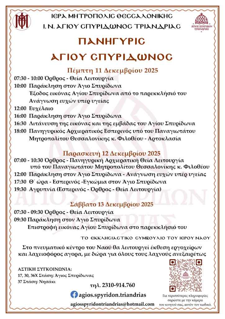 Οι ιερείς και το εκκλησιαστικό συμβούλιο του Ιερού Ναού Αγίου Σπυρίδωνος Τριανδρίας, έχουν την τιμή και την χαρά να σας προσκαλέσουν στις εόρτιες πανηγυρικές, λατρευτικές εκδηλώσεις που θα λάβουν χώρα από την Πέμπτη 11 Δεκεμβρίου έως και το Σάββατο 13 Δεκεμβρίου.