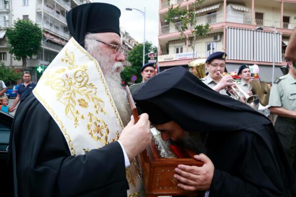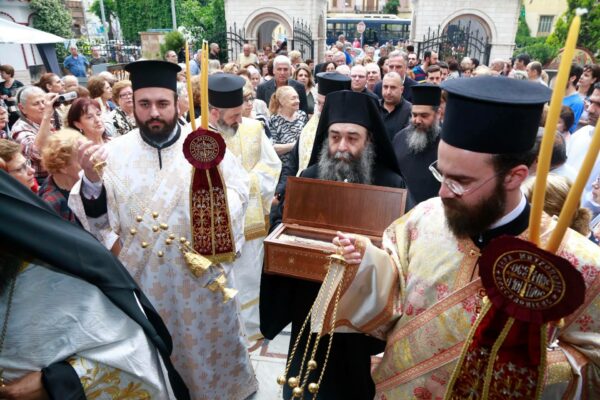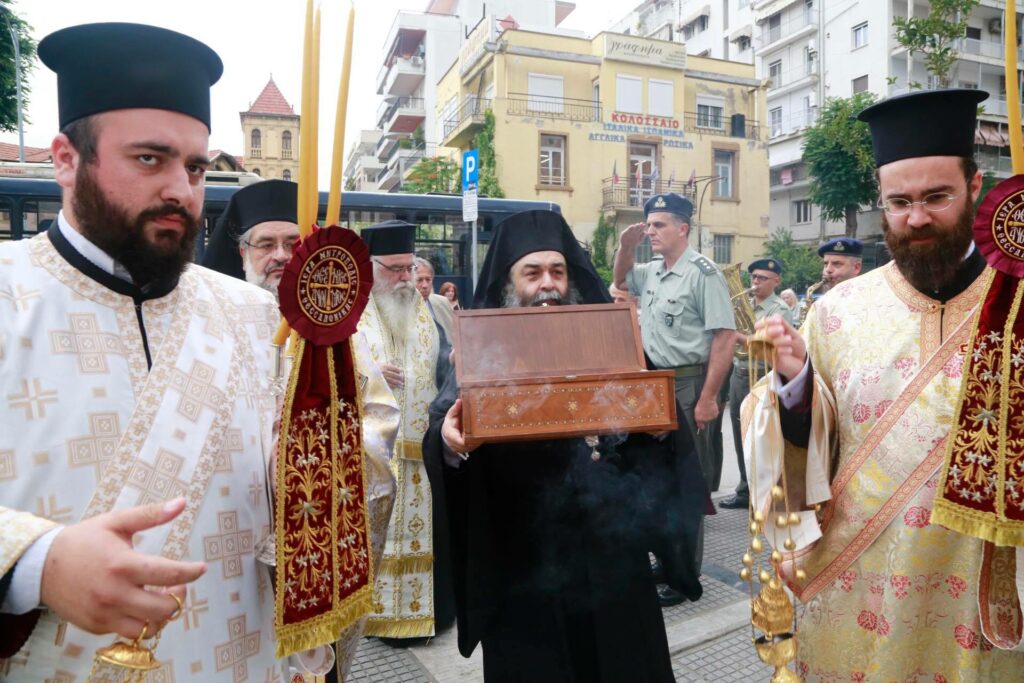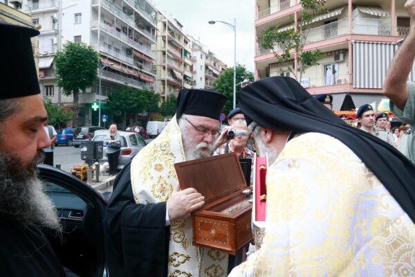 Το Ιερό Λείψανο μετέφερε στην πόλη της Θεσσαλονίκης ο Σεβ. Μητροπολίτης Καστορίας κ. Σεραφείμ με τη συνοδεία του. Το Ιερό Λείψανο το υποδέχτηκε, μαζί με τον Πρωτοσύγκελλο της Ιεράς Μητροπόλεως Θεσσαλονίκης, ο προϊστάμενος του Ιερού Ναού και Γενικός Αρχιερατικός Επίτροπος Αρχιμ. Φώτιος Ζαρζαβατσάκης, παρουσία ιερέων και πλήθος κόσμου.