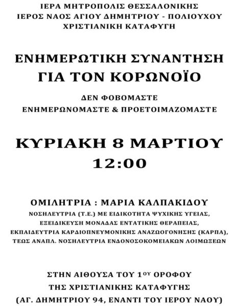 Ενημερωτική συνάντηση για τον κορωνοϊό θα πραγματοποιηθεί την Κυριακή 8 Μαρτίου στις 12:00 το πρωί στην αίθουσα του 1ου ορόφου της Χριστιανικής Καταφυγής (Αγίου Δημητρίου 94, έναντι του Ιερού Ναού) στη Θεσσαλονίκη.