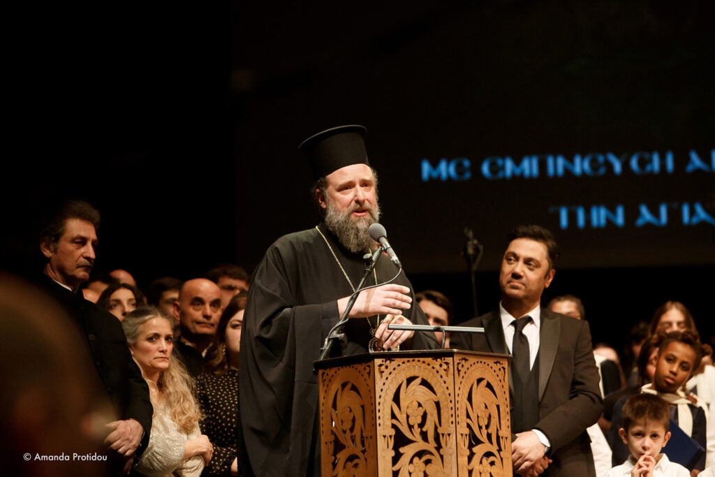Ο Παναγιώτατος, απηύθυνε σύντομο χαιρετισμό προ το τέλος της εκδήλωσης, “Νομίζω ότι η αποψινή βραδιά υπήρξε πραγματικά μία φωτεινή βραδιά. Μια υμνολογία, δεν χρησιμοποιώ τυχαία τον όρο, προς το πρόσωπο της Υπεραγίας Θεοτόκου για εκείνη που ονομάζεται και είναι η Μητέρα του Φωτός και όπου μέσα από το φως του Χριστού, που μας φέρνει η ίδια, δίνει τη δυνατότητα να αισθανθούμε και εμείς πραγματικά φωτεινοί άνθρωποι. Όλοι γνωρίζουμε τον Γιώργο Θεοφάνους ως έναν πραγματικά σπουδαίο καλλιτέχνη, μουσικό, συνθέτη, οποίος μέσα από το έργο του γνωρίζει να αγγίζει τις ευαίσθητες χορδές των ψυχών μας. Σήμερα, αποκαλύφθηκε ως ένας άνθρωπος ο οποίος μπορεί να αποκαλύπτει σε εμάς τις δικές του ευαίσθητες χορδές. Γιατί τι άλλο από ευαισθησία έχει ένας άνθρωπος, ο οποίος υμνολογεί τον Θεό και προσφέρει ό,τι καλύτερο έχει και ό,τι καλύτερο είναι προς εκείνον και δίνει τη δυνατότητα και σε πολλούς περισσοτέρους ανθρώπους να χαρούν τα δικά του δημιουργήματα και να αισθανθούν ότι και εκείνοι εκφράζονται μέσα από τον δικό του τρόπο μουσικής έκφρασης”.