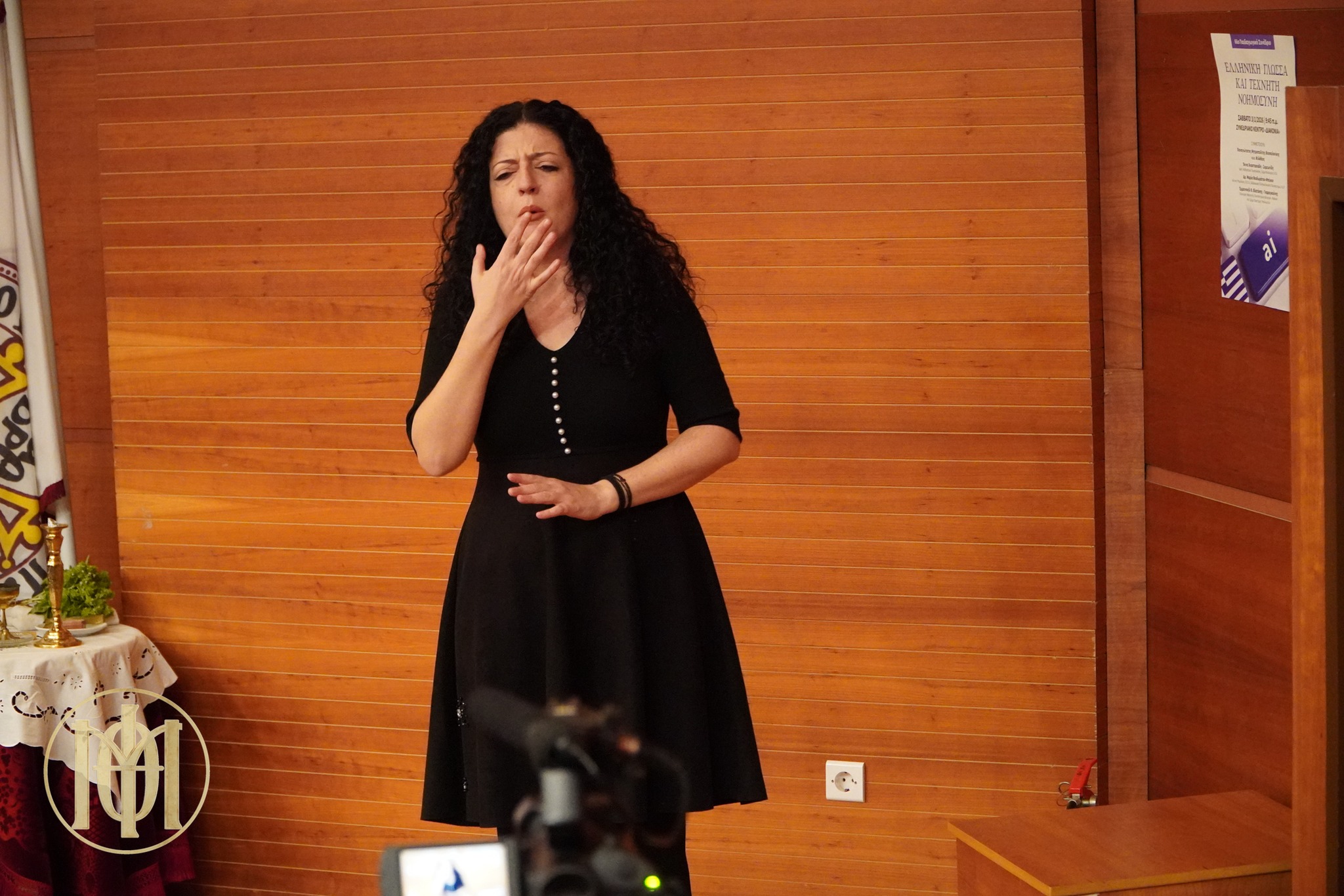 Καθ’ όλη τη διάρκεια του Συνεδρίου εκπαιδευτές από την Ένωση Κωφών Βορείου Ελλάδος παρουσίαζαν στη νοηματική γλώσσα τις εισηγήσεις των ομιλητών για τους αδελφούς μας κωφαλάλους.