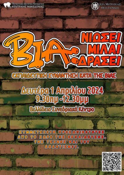 Η Ιερά Μητρόπολη Θεσσαλονίκης, σε συνεργασία με την Περιφερειακή Διεύθυνση Πρωτοβάθμιας και Δευτεροβάθμιας Εκπαίδευσης Κεντρικής Μακεδονίας, διοργανώνει Εκπαιδευτική Εκδήλωση κινητοποίησης κατά της βίας, με τίτλο «Βία: Νιώσε! Μίλα! Δράσε!», η οποία θα πραγματοποιηθεί την Δευτέρα, 1 Απριλίου 2024 και ώρες 10:00 π.μ. – 12:30, στο Βελλίδειο Συνεδριακό Κέντρο.