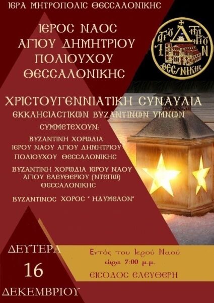 ΙΕΡΟΣ ΝΑΟΣ ΑΓΙΟΥ ΔΗΜΗΤΡΙΟΥ ΠΟΛΙΟΥΧΟΥ ΘΕΣΣΑΛΟΝΙΚΗΣ – Χριστουγεννιάτικη Συναυλία Εκκλησιαστικών Βυζαντινών Ύμνων, κατά την εσπέρα της Δευτέρας 16ης Δεκεμβρίου 2019 – ΕΙΣΟΔΟΣ ΕΛΕΥΘΕΡΗ.